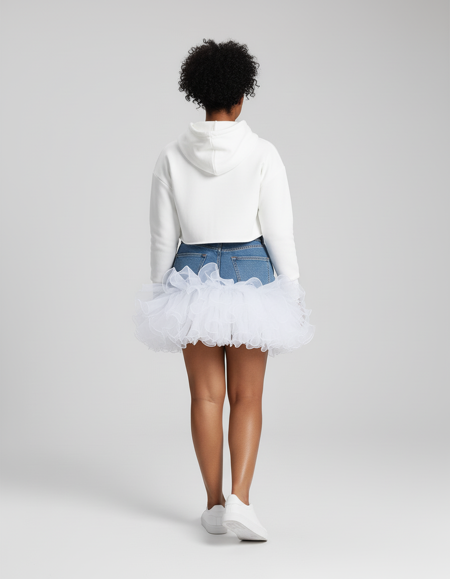 Au-delà de son allure festive évidente, notre Jupe Boule en Jean se révèle être un véritable caméléon de style. Pour une soirée mémorable, associez-la à un top en soie ajusté et des talons aiguilles, ou osez l'audace moderne avec un crop-top décontracté et des baskets immaculées, comme le montre notre égérie. Sa conception ingénieuse, alliant la robustesse du jean à la légèreté du tulle, garantit une liberté de mouvement inégalée. Dansez, bougez, vivez : cette jupe est pensée pour vous accompagner sans contrainte, vous offrant un confort absolu du matin au soir, sans jamais compromettre votre élégance naturelle.