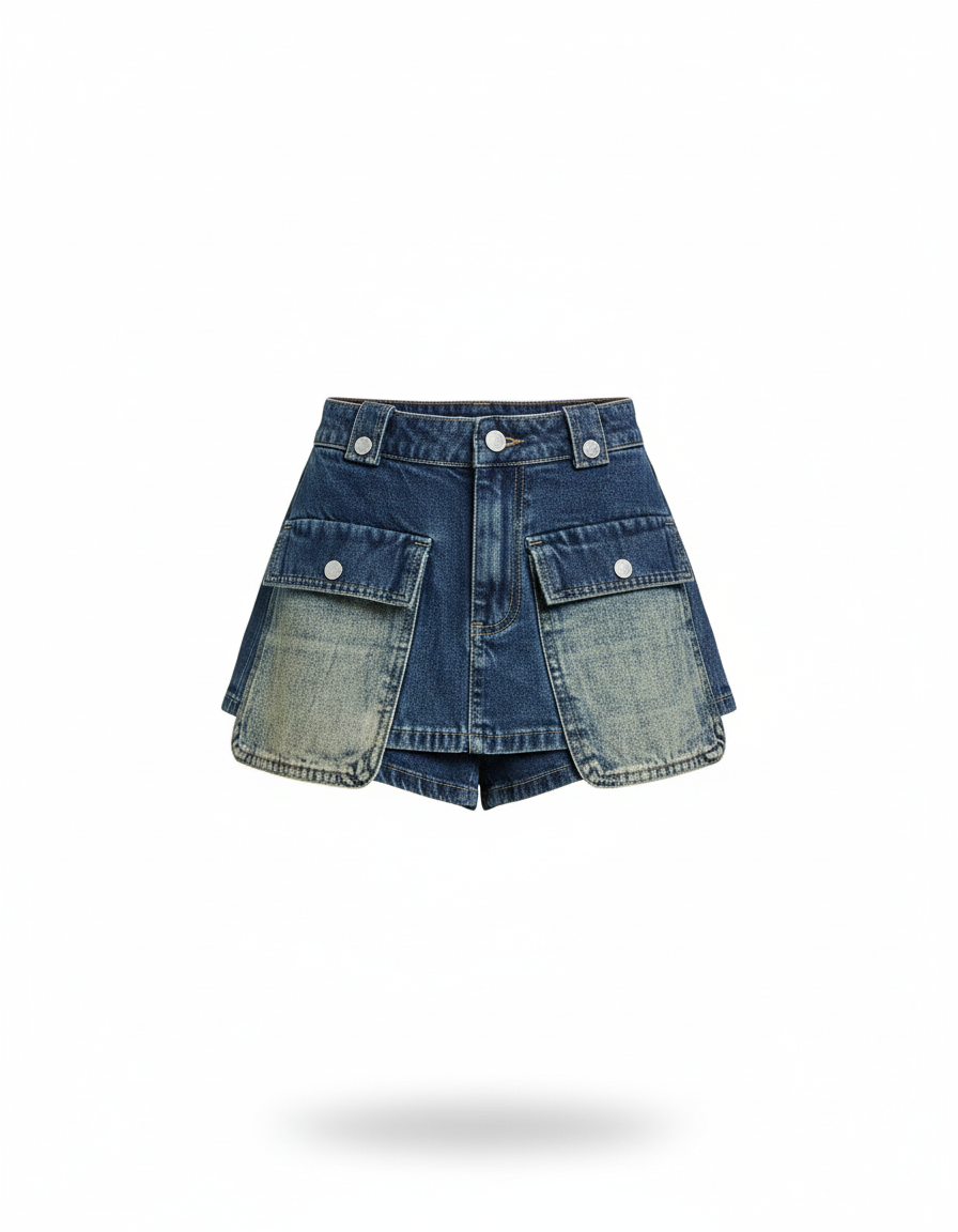 Cette Jupe Culotte En Jeans est un vêtement court en denim présentant une coupe évasée. Elle intègre une superposition de tissus créant un effet jupe-short.