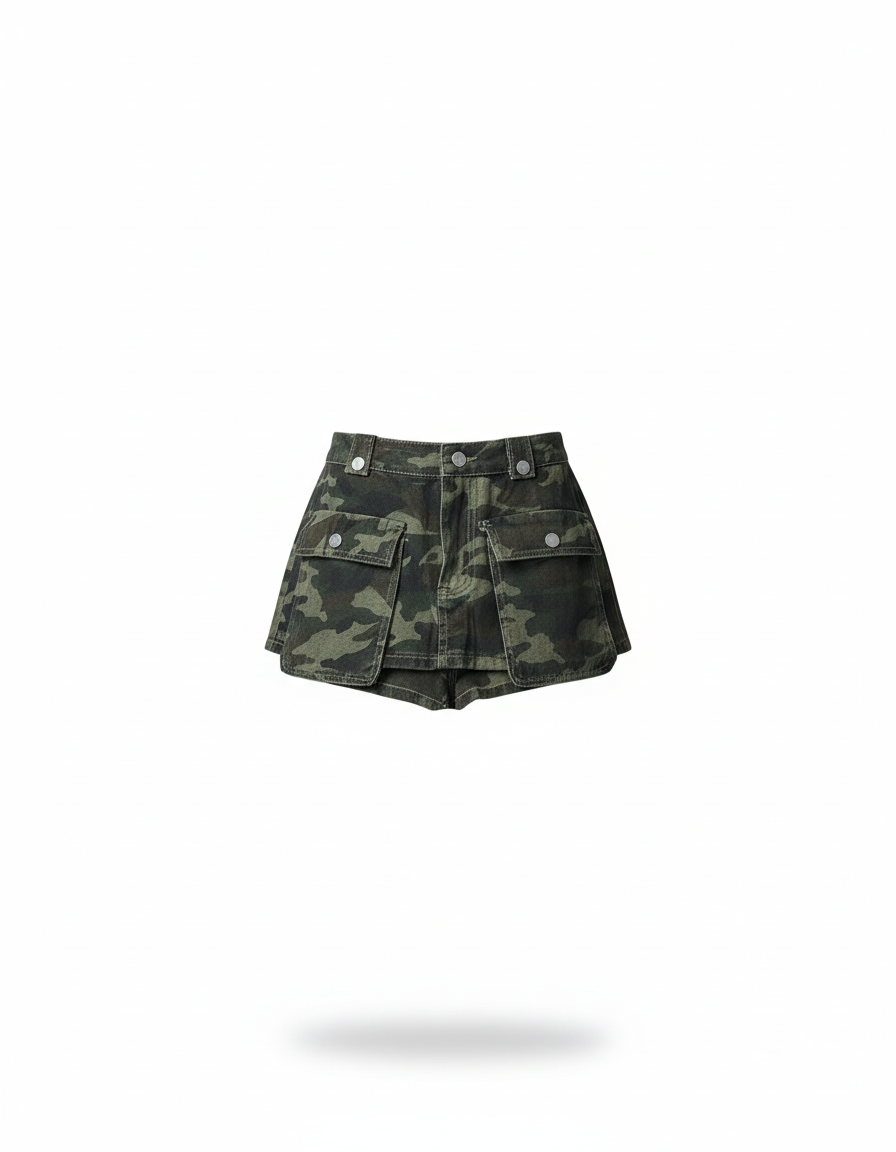 Cette jupe culotte présente une coupe courte et un motif camouflage. Elle est équipée de multiples poches cargo et d'une fermeture boutonnée visible sur le devant.