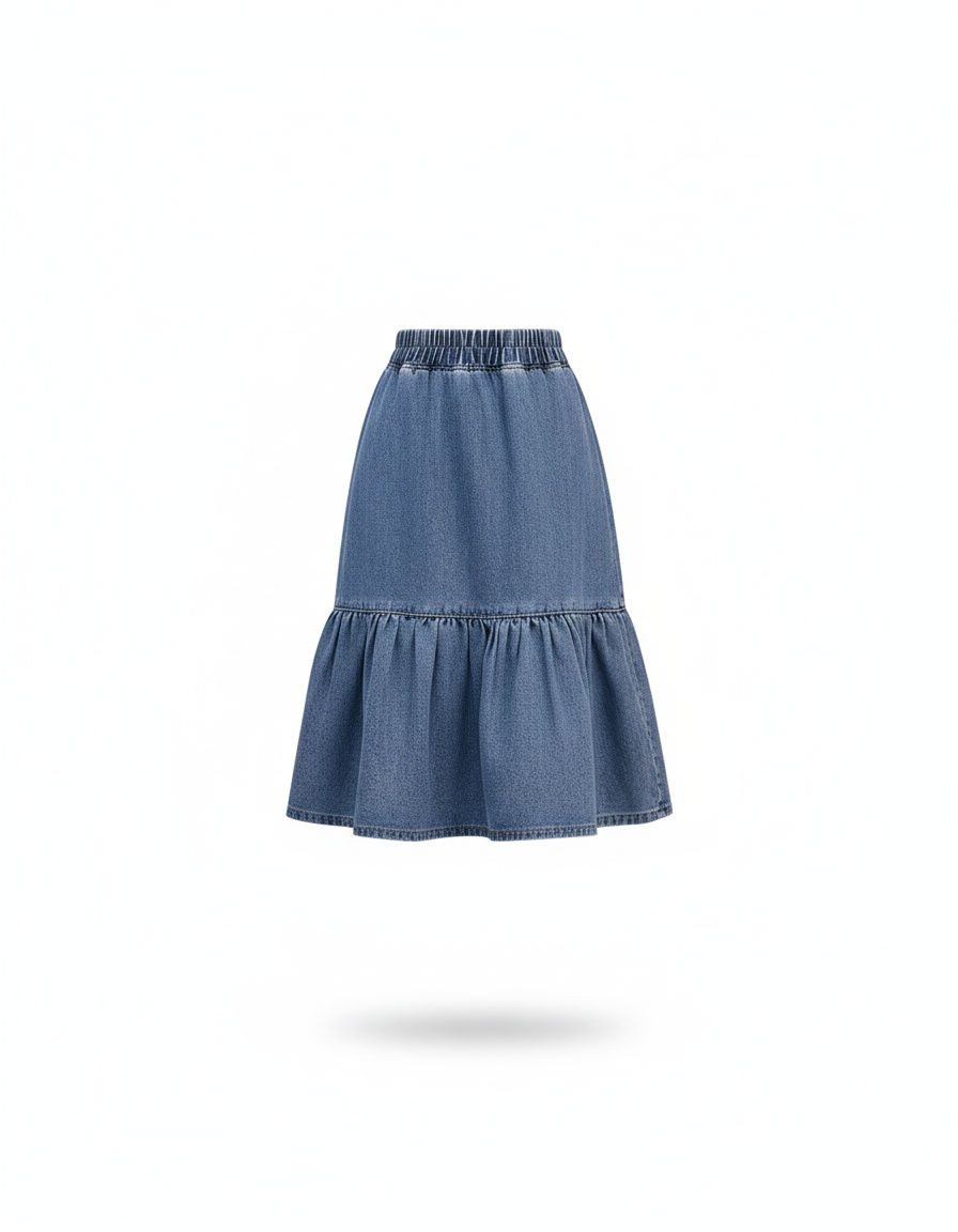 Découvrez la fusion parfaite entre confort et style avec notre Jupe En Jean À Volant. Confectionnée dans un denim premium bleu uni, sa matière douce et résistante vous enveloppe d'une sensation agréable tout au long de la journée. Sa taille élastiquée intelligente garantit un ajustement idéal, épousant votre silhouette sans jamais la contraindre, offrant ainsi une liberté de mouvement incomparable. Le volant délicatement intégré en bas de jupe assure un tombé fluide et gracieux, ajoutant une touche de féminité et de légèreté à chacun de vos pas.