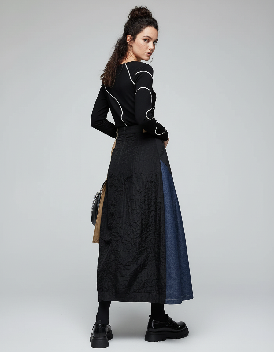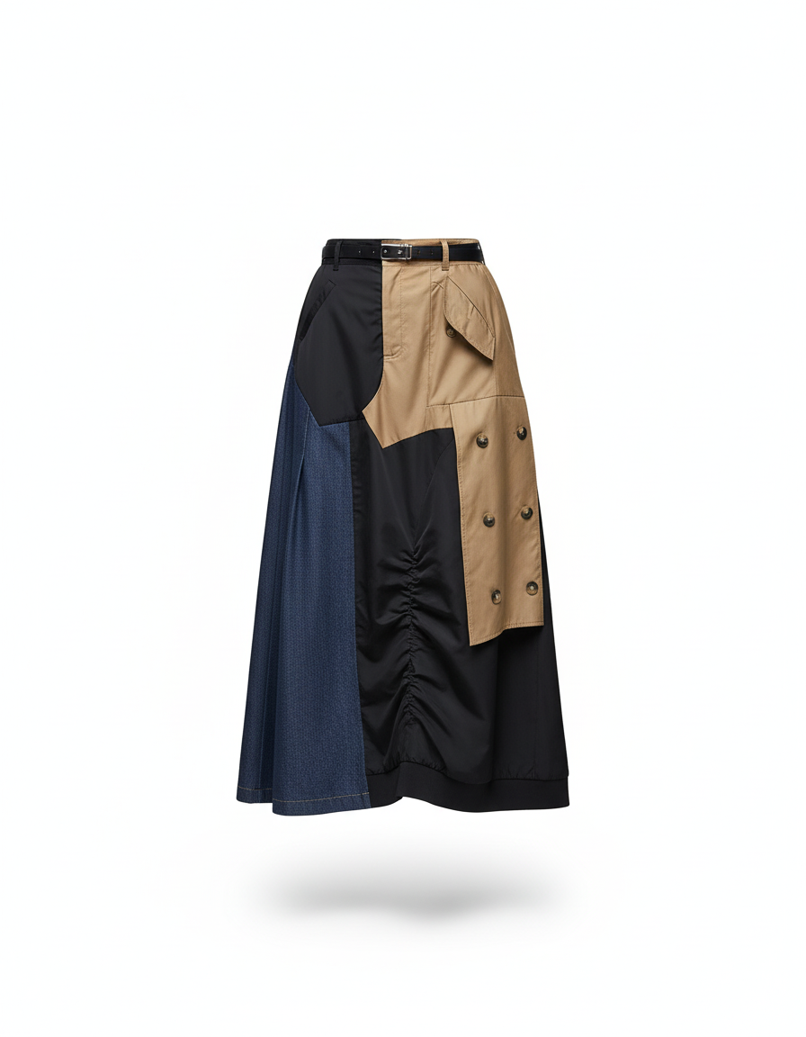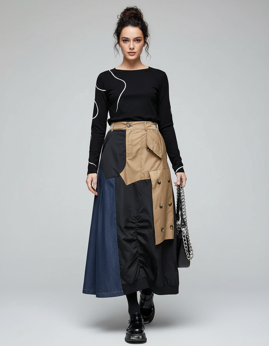 Réinventez votre garde-robe avec notre Jupe 'Boutons & Denim', une pièce maîtresse conçue pour celles qui osent. Son design asymétrique audacieux, mêlant le denim intemporel, un tissu technique noir structuré et des empiècements beige inspirés du trench-coat, en fait une œuvre d'art portable. Parfaite pour une sortie chic, elle se prête à une multitude de styles : associez-la à un chemisier en soie pour un dîner élégant, ou à un pull fin et des bottines pour une allure urbaine sophistiquée. Chaque détail, des boutons métalliques aux textures contrastées, témoigne d'une confection haut de gamme et d'une esthétique résolument moderne.