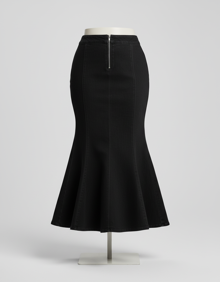 Cette jupe est une jupe en denim noir à taille haute, dotée d'une fermeture éclair visible sur le devant. Sa coupe ajustée s'évase en forme de sirène vers le bas.