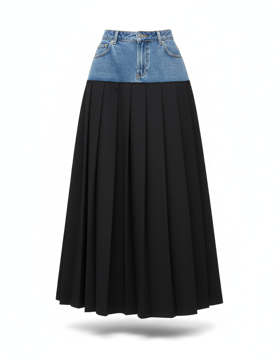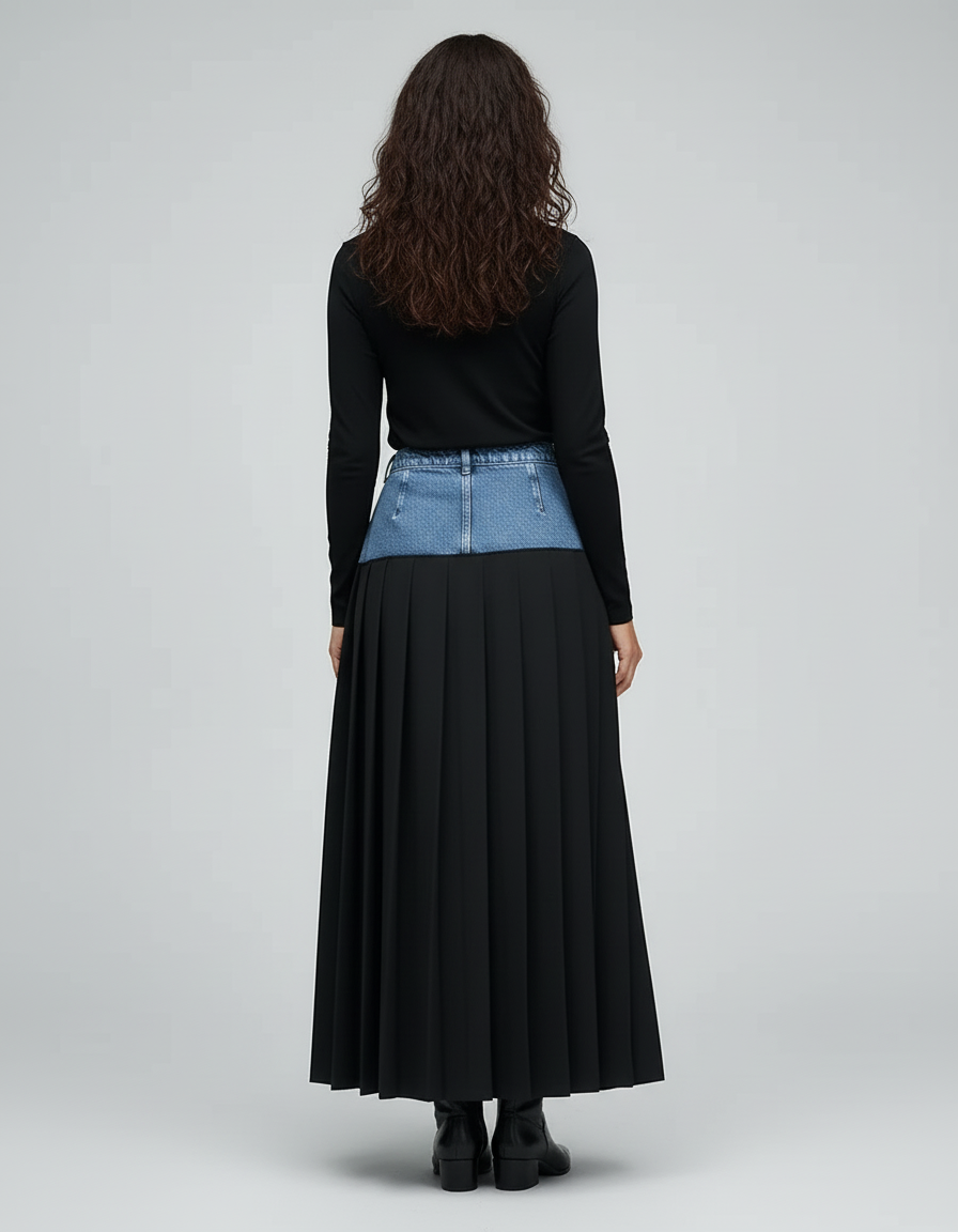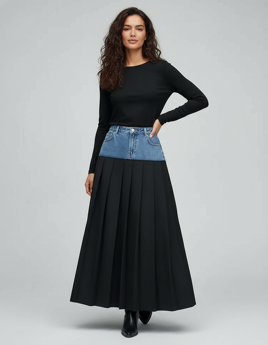 Cette jupe longue combine une section supérieure en jean avec une partie inférieure plissée noire. Elle présente un design bicolore.