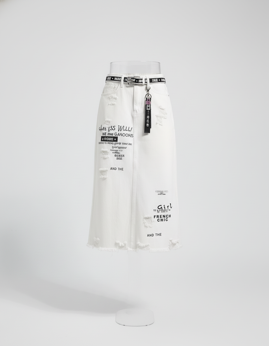 Cette jupe en jean est de couleur blanche et présente une coupe midi. Elle est ornée de textes imprimés noirs et de détails déchirés sur le tissu.
