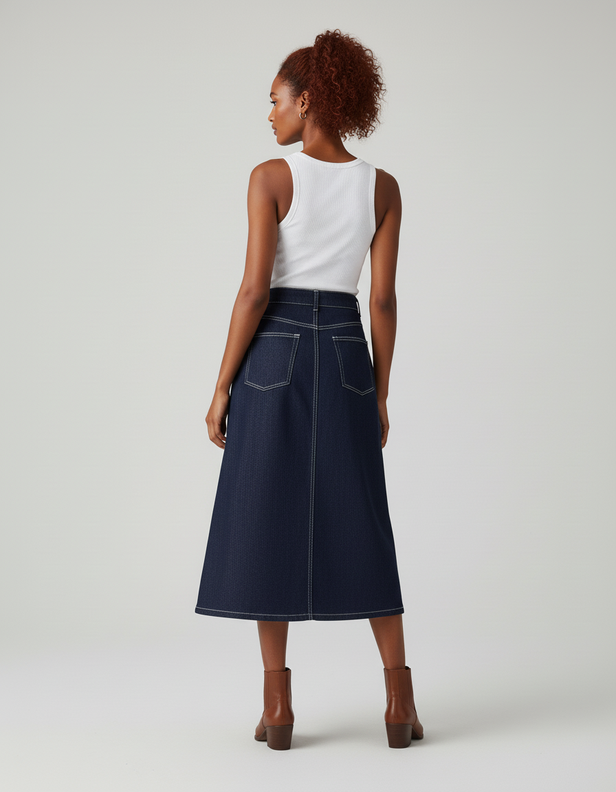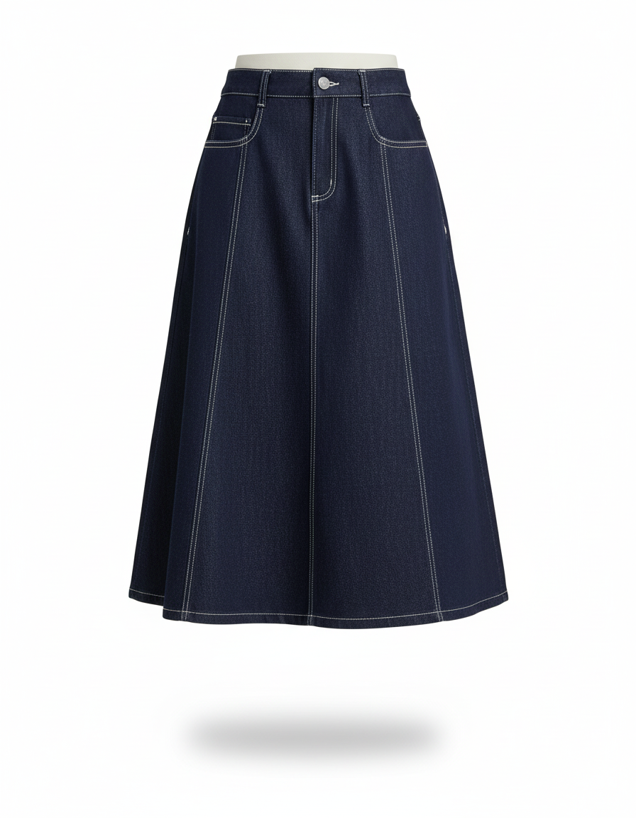 Cette jupe en jean pour femme est de couleur bleu brut, caractérisée par une longueur mi-mollet et une coupe évasée en A. Elle présente des coutures contrastées visibles sur ses empiècements et ses poches avant.