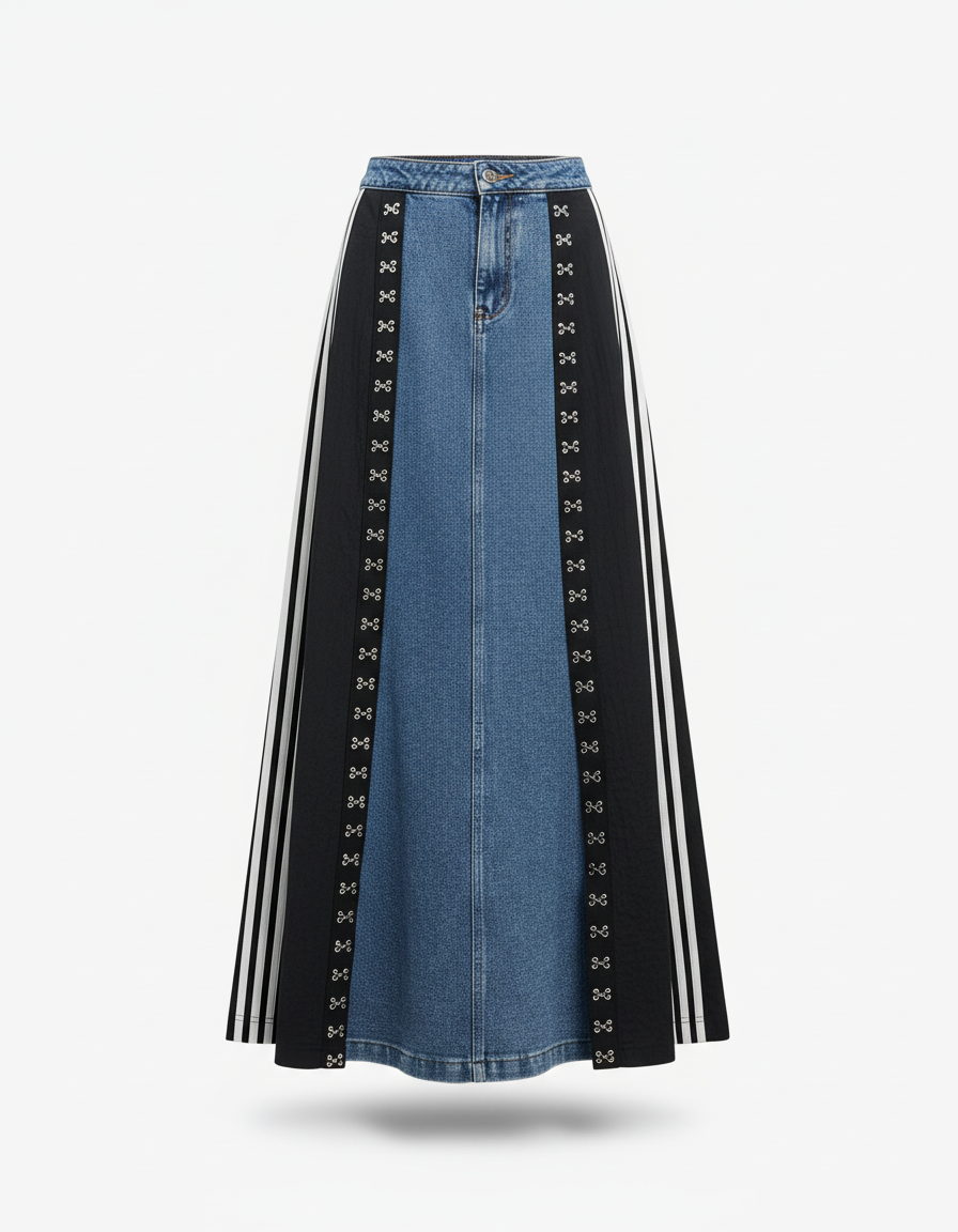 Ce qui distingue cette jupe, c'est son assemblage ingénieux de matières et de textures. Le denim central, intemporel, est encadré de panneaux latéraux noirs structurés, ornés d'une série de boutons décoratifs métalliques qui ajoutent une touche d'éclat et de caractère. Les bandes sportives emblématiques sur l'un des côtés insufflent une dynamique contemporaine, créant un contraste saisissant et une silhouette allongée. C'est une œuvre de design qui célèbre la fusion des genres, offrant une polyvalence inégalée pour composer des looks aussi décontractés que résolument chics. Affirmez votre singularité avec cette jupe qui ne ressemble à aucune autre.