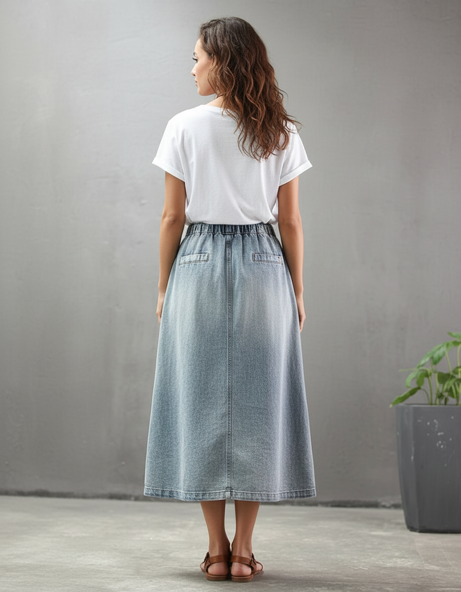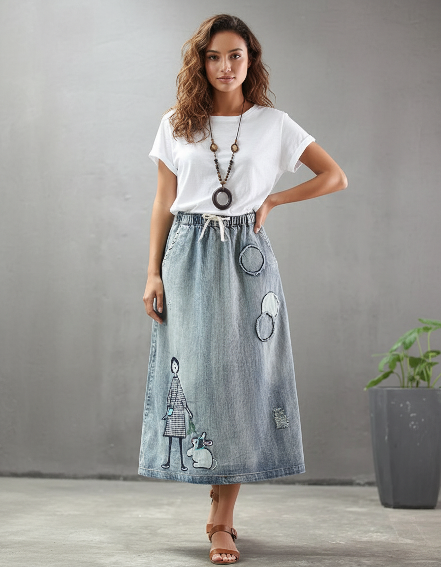 Jupe En Jean Brodée : coupe longue et taille élastique