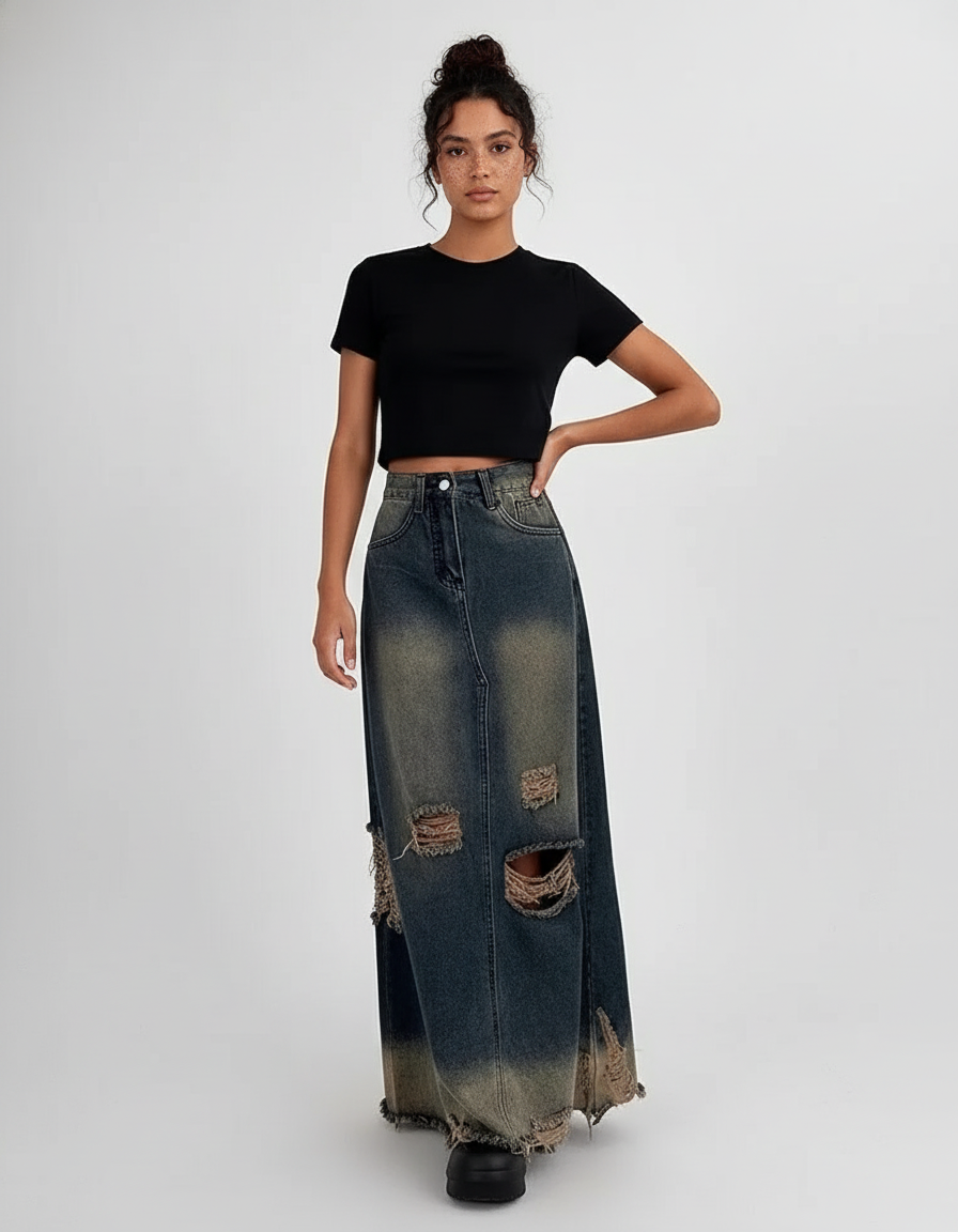 Adoptez un look audacieux et décontracté avec notre jupe en jean maxi déchirée.