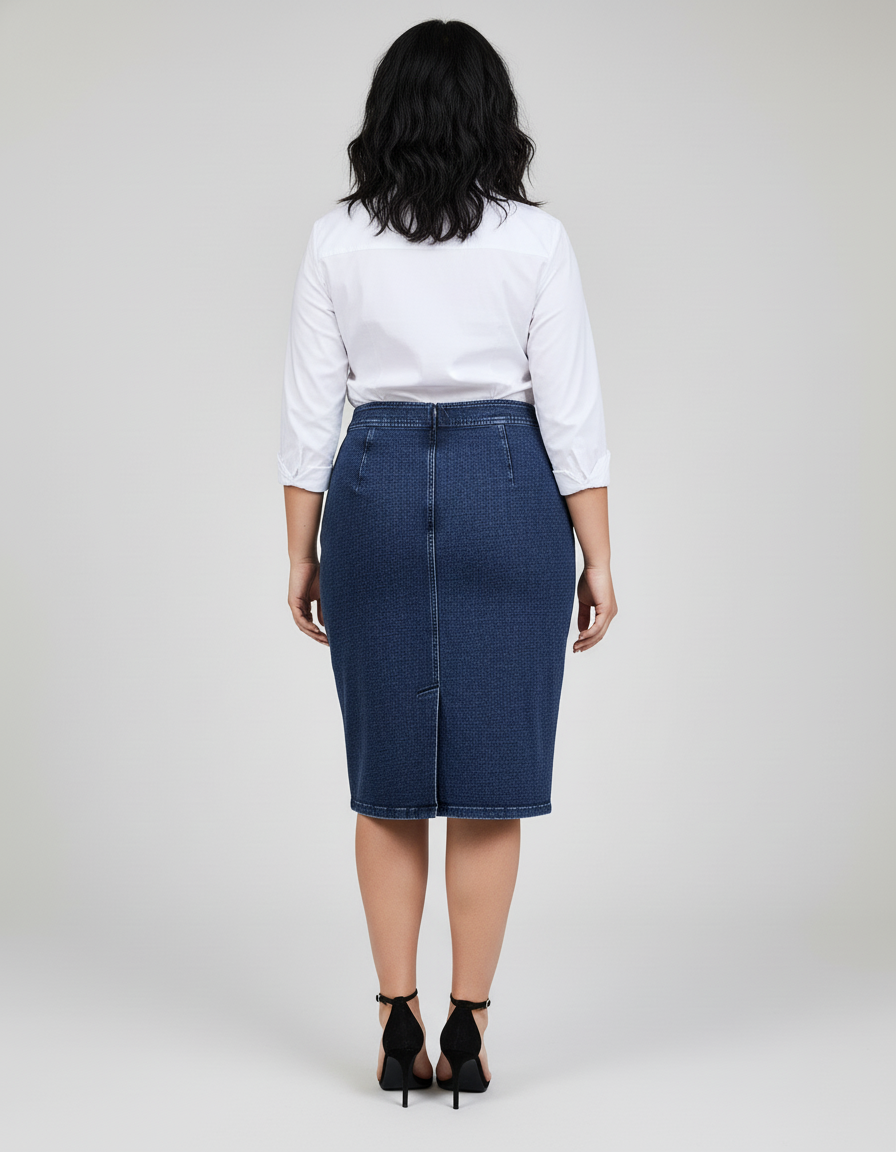 Transformez votre garde-robe professionnelle avec notre jupe crayon en jean bleu foncé, spécialement conçue pour sublimer la femme ronde. Son imprimé géométrique subtil apporte une touche de modernité et de raffinement, parfait pour le bureau. Associez-la à une blouse fluide ou une chemise impeccable pour un look chic et affirmé. Le denim premium, choisi pour sa douceur et sa tenue, sculpte délicatement votre silhouette sans jamais la comprimer, offrant un confort absolu du matin au soir.