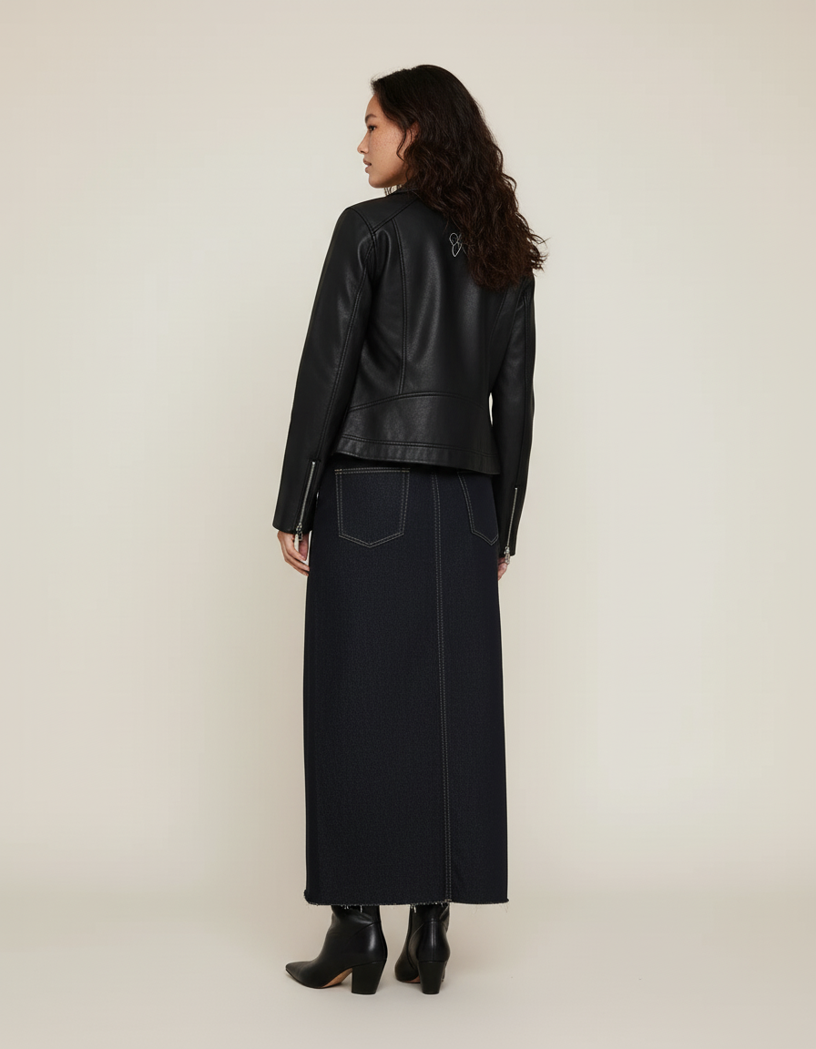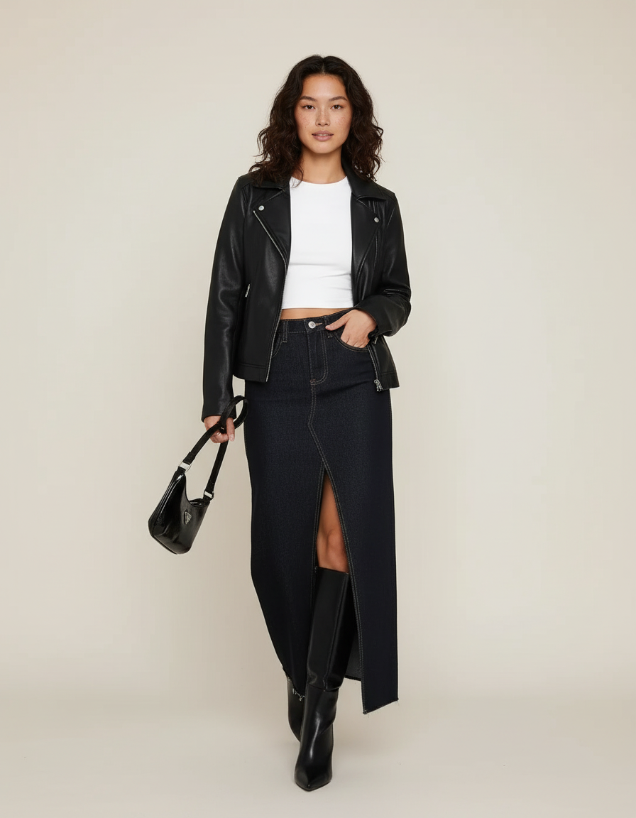 La Jupe En Jean Fente se prête à une multitude d'interprétations. Pour une allure audacieuse et moderne, comme sur nos visuels, associez-la à un crop top épuré et une veste en cuir. Complétez avec des bottes hautes pour une touche rock-chic irrésistible, parfaite pour vos sorties ou vos soirées. Pour une approche plus décontractée mais toujours élégante, optez pour un pull en maille fine et des baskets blanches. En journée, un chemisier fluide et des sandales à talons transformeront cette pièce en un atout sophistiqué pour un brunch ou une réunion informelle.