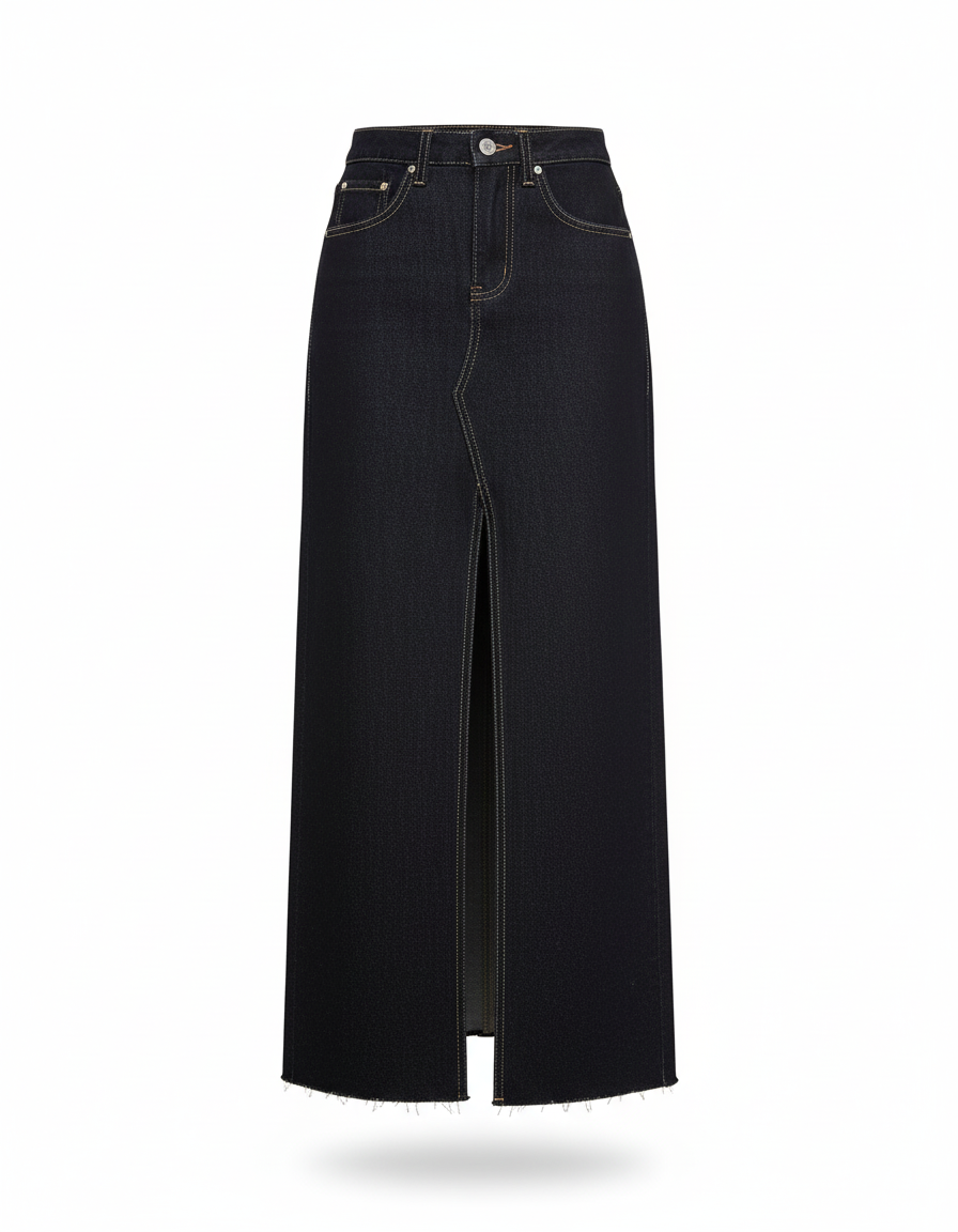Découvrez notre élégante jupe en jean maxi avec une fente audacieuse pour un look moderne et sophistiqué.