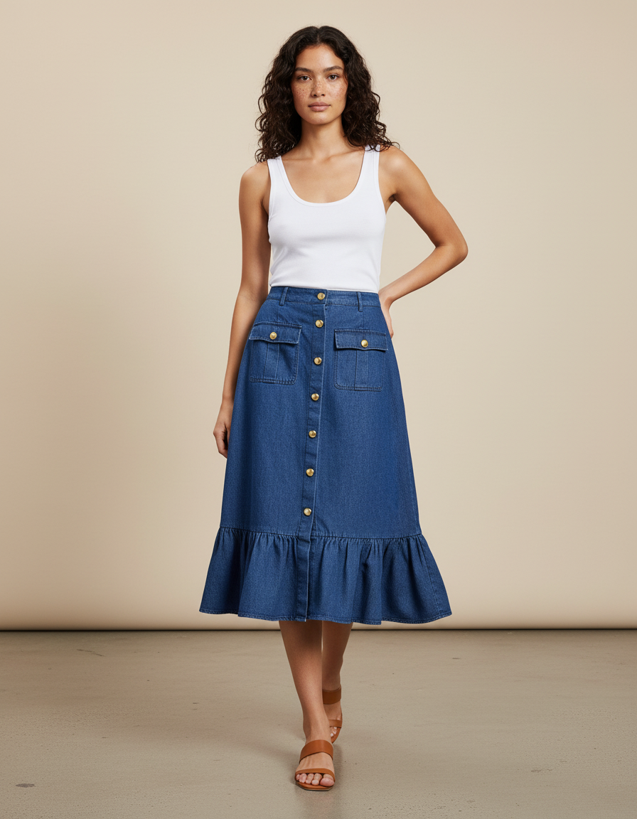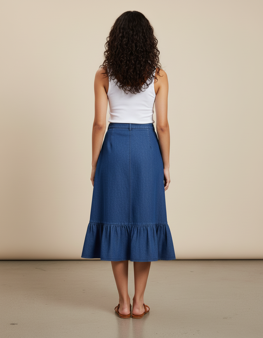 Conçue pour exceller, cette jupe ne transige ni sur le confort ni sur le style. Son denim haut de gamme, choisi pour sa douceur et sa tenue impeccable, garantit une liberté de mouvement absolue. La coupe évasée et le volant délicatement structuré accompagnent chacun de vos pas avec une fluidité naturelle, sans jamais entraver. Le tombé est irréprochable, épousant délicatement la silhouette tout en offrant une aisance parfaite. Vous vous sentirez à l'aise et élégante, du matin au soir, grâce à une conception pensée pour votre bien-être et un rendu visuel premium.