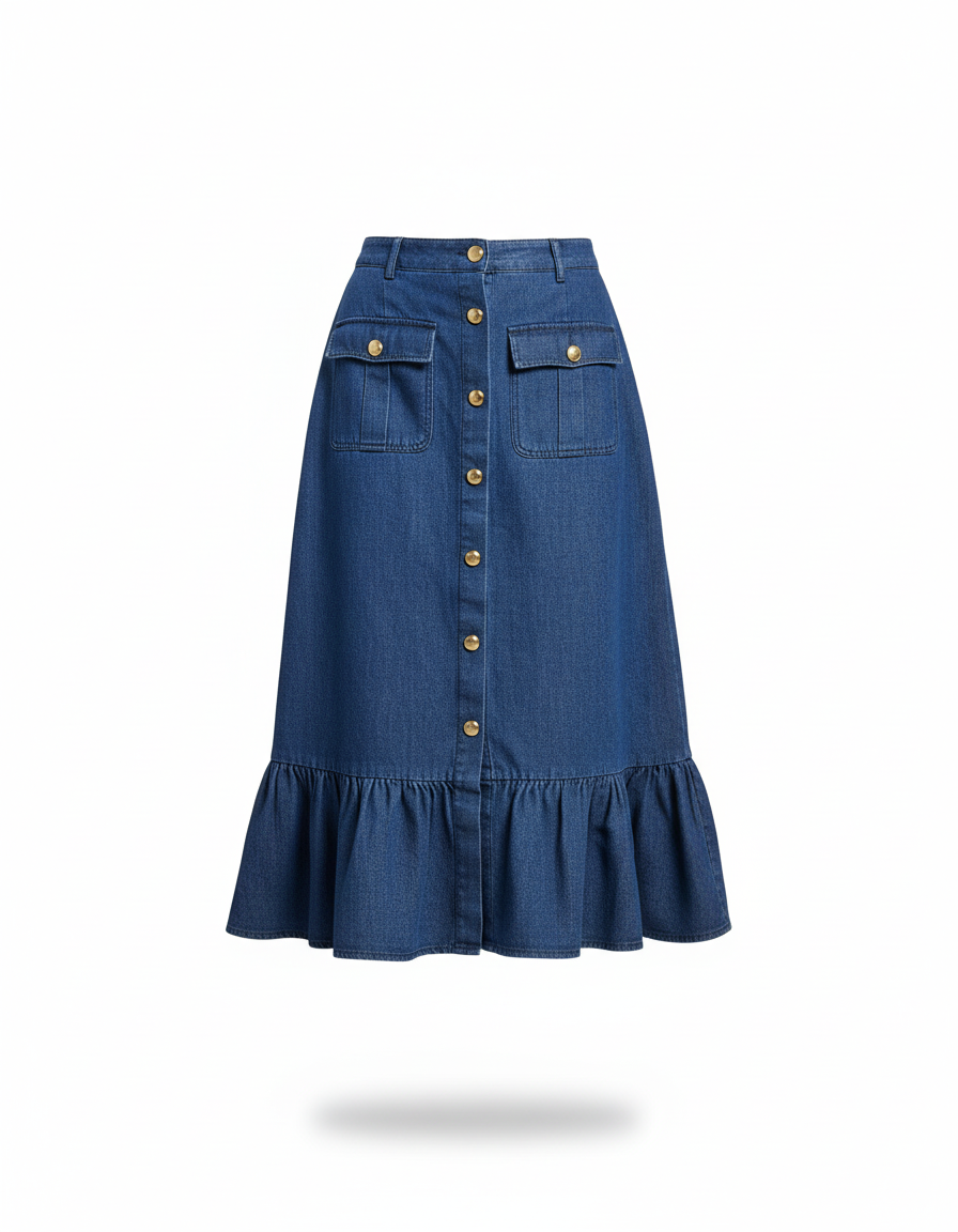 Cette jupe est en denim de couleur bleu foncé. Elle présente une coupe midi avec une fermeture boutonnée sur le devant et un ourlet à volants.