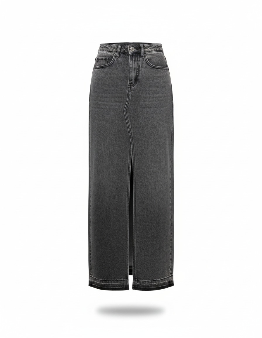 Jupe En Jean Gris Mi-Longue avec Fente Avant