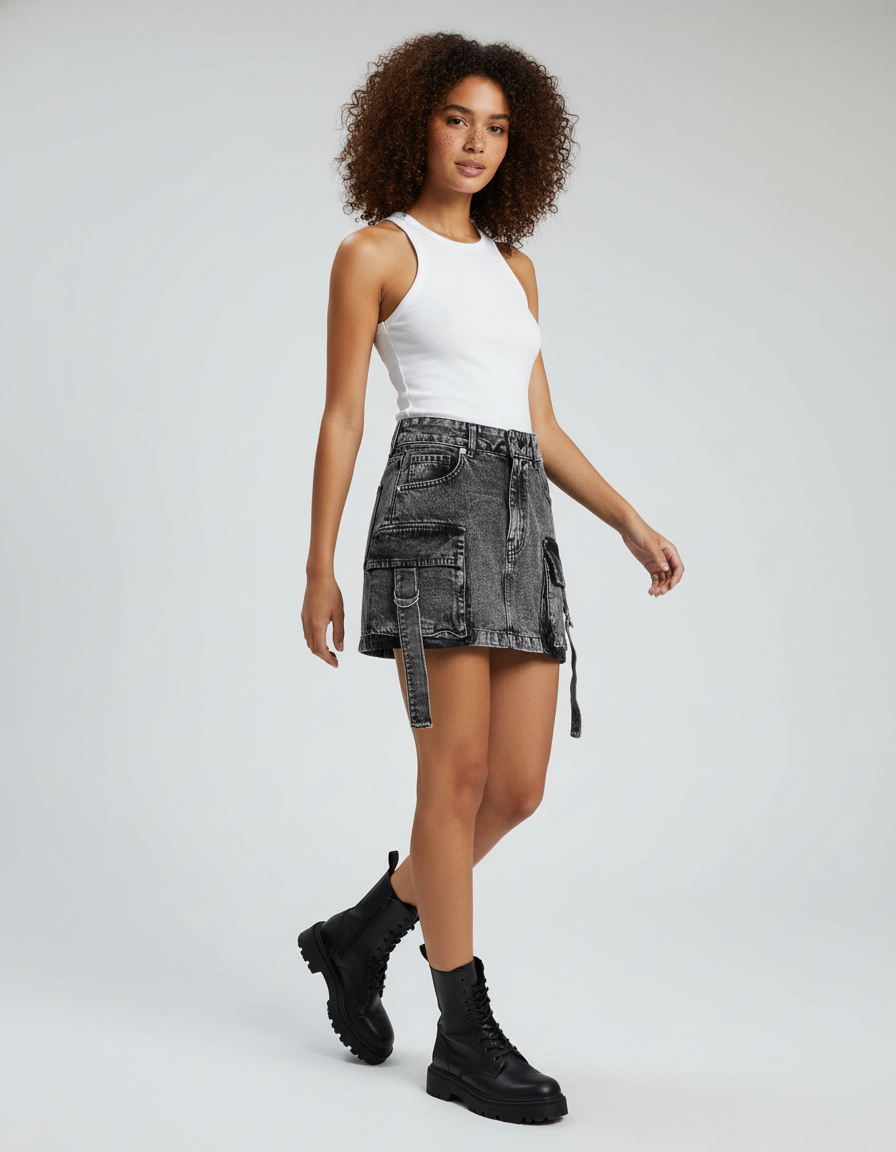 Ce qui distingue notre Jupe En Jean Grise Courte, c'est son mariage audacieux entre le confort intemporel du denim premium et un design résolument avant-gardiste. La teinte grise, travaillée avec un effet tie & dye subtil, offre une profondeur visuelle incomparable, tandis que les détails cargo pratiques et les lanières ajustables ajoutent une touche utilitaire-chic, signature de notre marque haut de gamme. Chaque élément est pensé pour une polyvalence optimale, vous permettant de la marier aussi bien avec un top élégant et des bottes pour une sortie en ville, qu'avec un simple t-shirt pour un style plus décontracté. Une pièce unique pour une allure qui ne l'est pas moins.