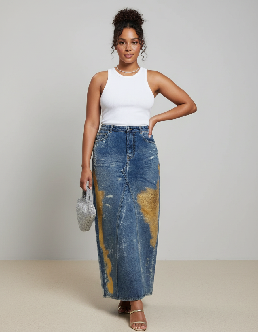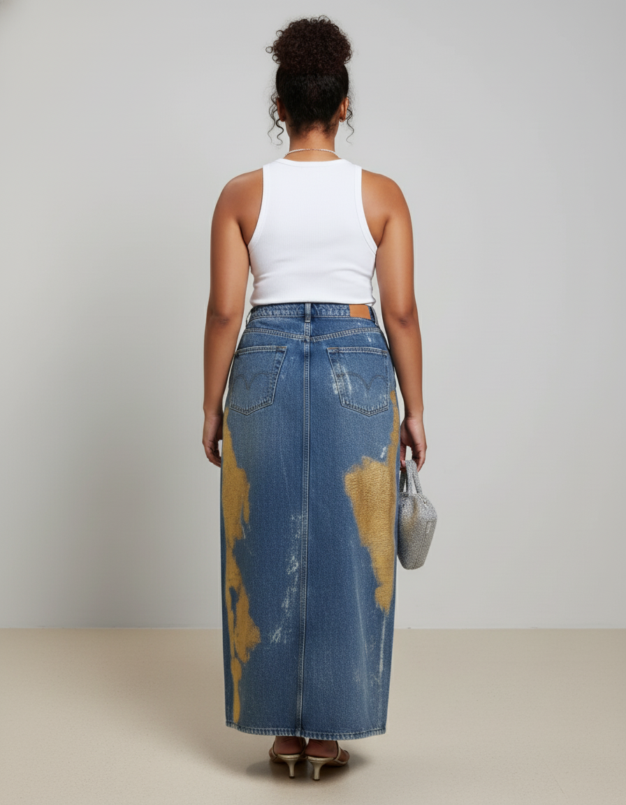Adoptez un look audacieux avec cette jupe en jean maxi, ornée de motifs jaunes distinctifs et d'un fini délavé unique.