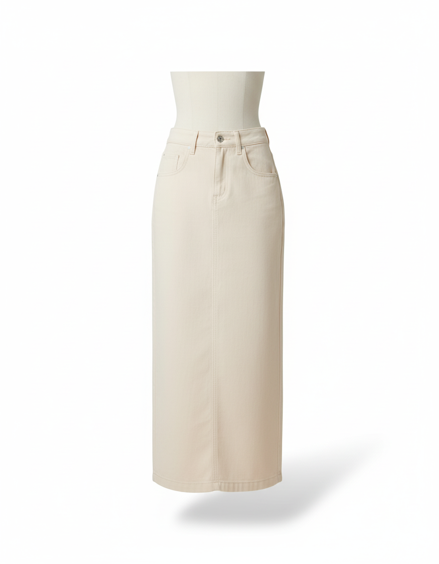 Adoptez un look décontracté et chic avec notre jupe en jean longue beige, un essentiel polyvalent pour votre garde-robe.