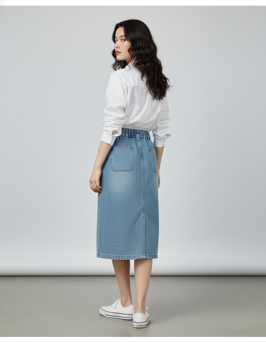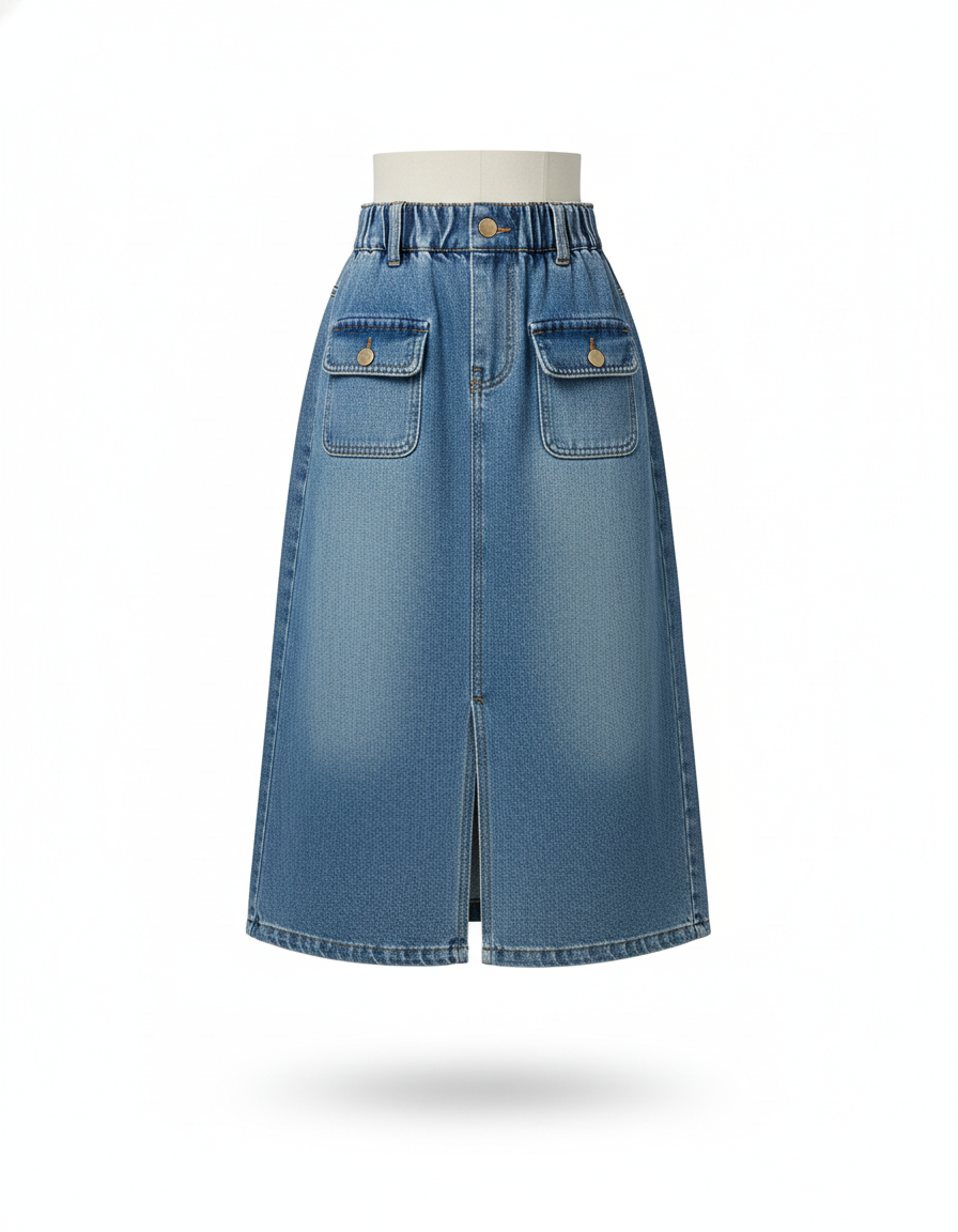 Cette Jupe En Jean Longue Fendue est un vêtement en denim de coupe midi, caractérisée par une fente centrale à l'avant et une taille élastiquée.