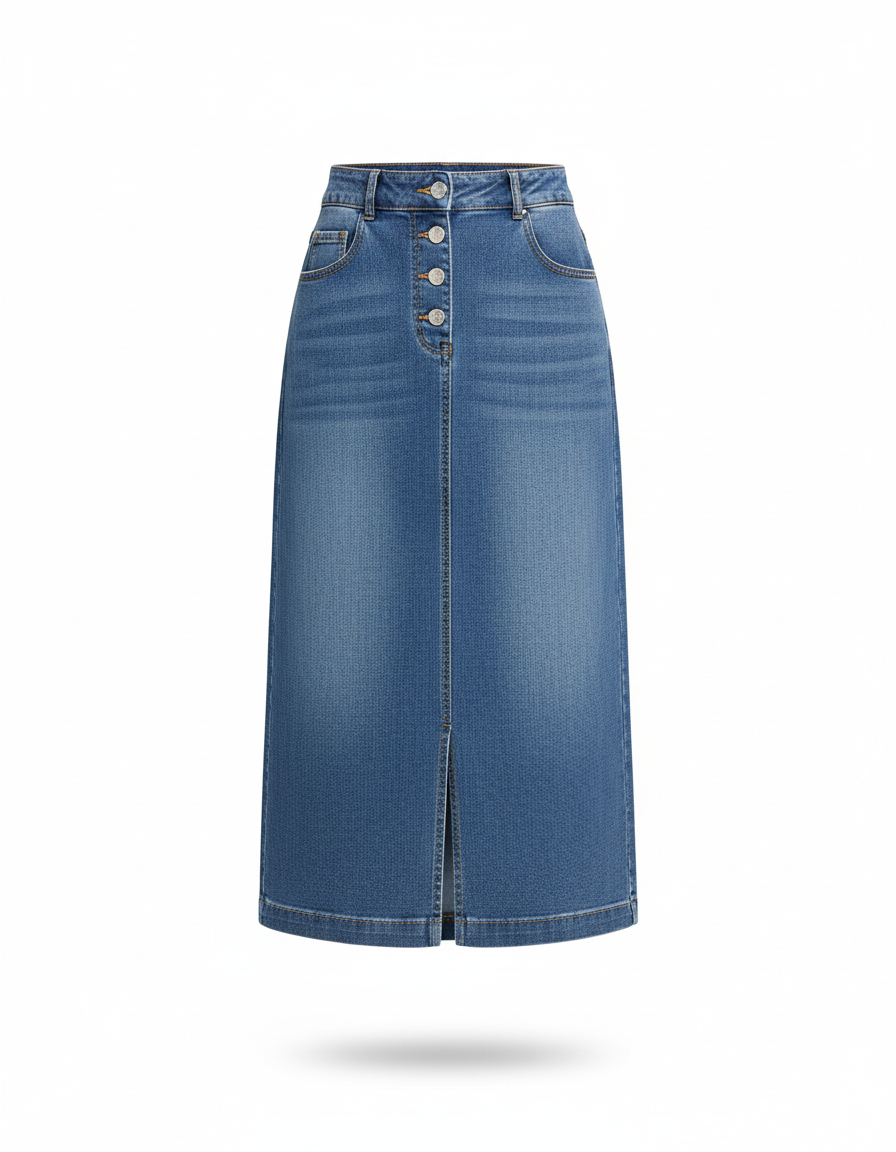 Cette jupe en jean présente une coupe taille haute et une longueur midi, s'étendant sous le genou. Elle est dotée d'une fermeture boutonnée sur le devant.