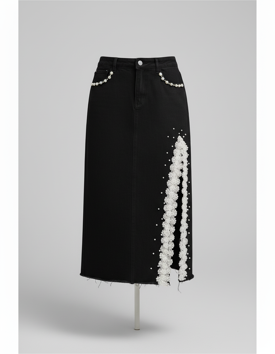 Cette jupe est un vêtement en denim de couleur noire. Elle est ornée de perles et présente une fente latérale.