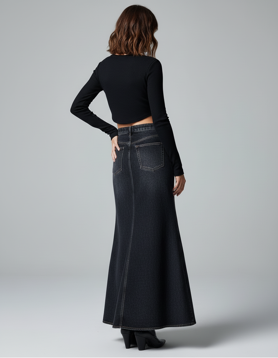 Cette jupe longue est fabriquée en denim de couleur noire délavée. Elle présente une silhouette ajustée sur le haut et évasée vers le bas.