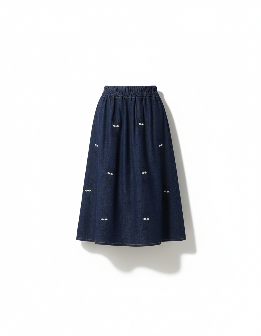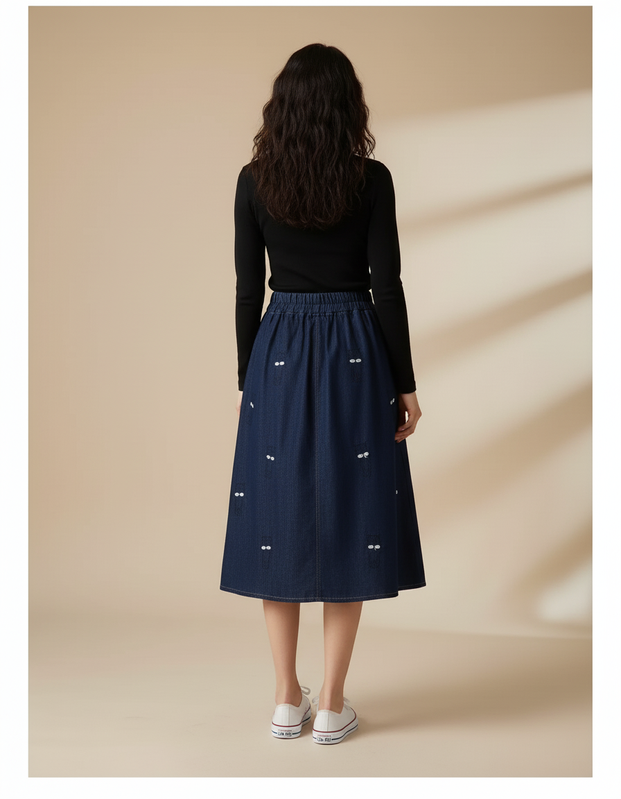 Cette jupe en jean présente une coupe trapèze et une longueur mi-mollet. Elle est dotée d'une taille élastiquée et de motifs brodés sur l'ensemble du tissu.