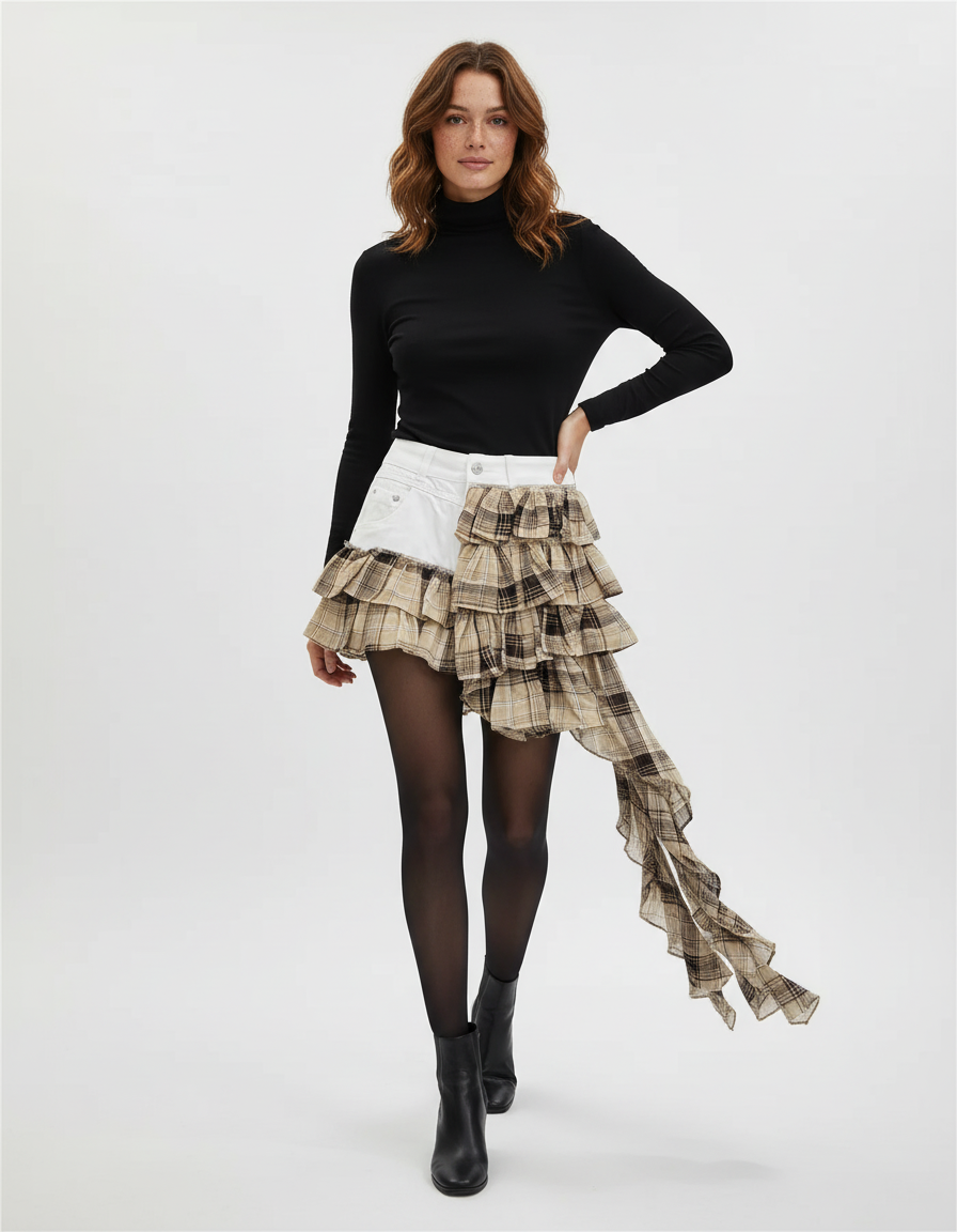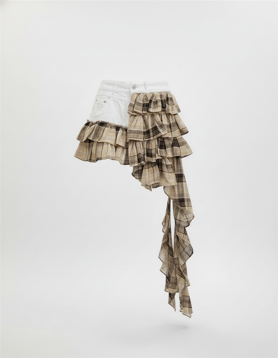 Ce qui rend cette jupe véritablement unique, c'est l'harmonie inattendue entre son denim blanc immaculé et ses volants asymétriques en tissu à carreaux beige et marron. Chaque volant est minutieusement travaillé, créant un mouvement fluide et une texture riche qui captivent le regard. Loin d'une simple jupe, c'est une œuvre d'art portable, rehaussée par une traîne subtile qui ajoute une dimension spectaculaire à votre démarche. Portez-la pour affirmer votre style, alliant la robustesse du jean à la délicatesse des volants pour une déclaration de mode audacieuse et haut de gamme.