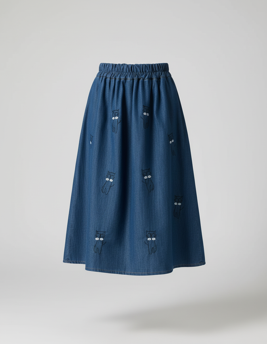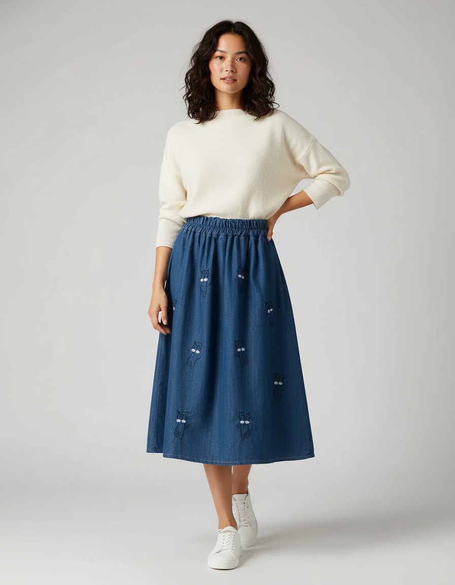 Jupe En Jeans Évasée à Motifs Chats Brodés