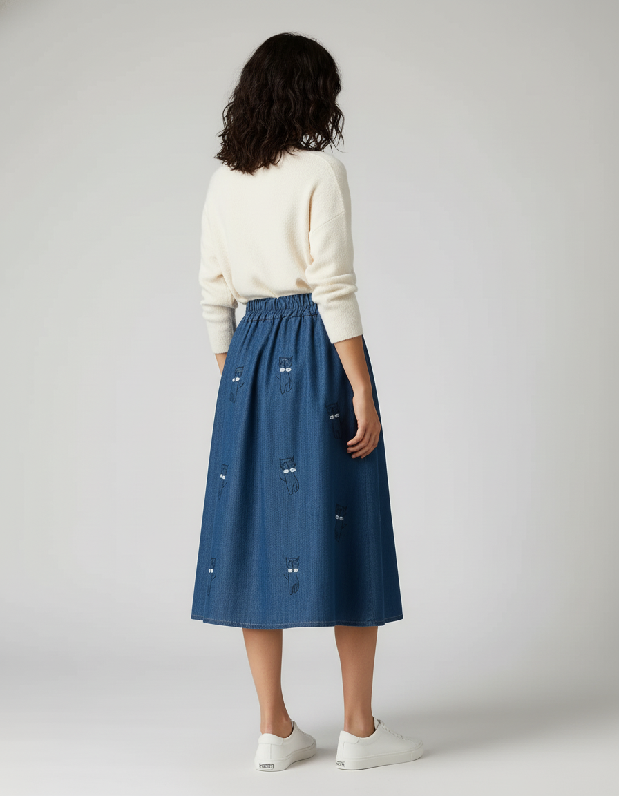 Conçue pour sublimer votre quotidien, notre jupe évasée en jean bleu est une ode à la liberté et à l'élégance décontractée. Son denim de qualité supérieure, choisi pour sa souplesse et sa résistance, garantit une liberté de mouvement absolue et un confort inégalé, quelle que soit votre activité. La taille élastiquée assure un maintien parfait sans jamais comprimer, tandis que son tombé impeccable épouse délicatement votre silhouette, offrant une allure fluide et aérienne. Les motifs de chats brodés avec finesse apportent une touche ludique et distinctive, transformant cette pièce en un véritable atout charme de votre garde-robe.