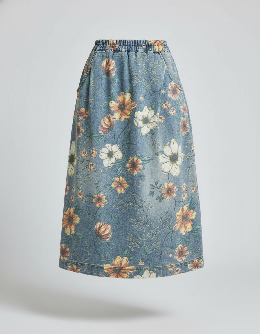 Cette Jupe En Jeans Mi Longue présente un motif floral imprimé sur un tissu en denim. Elle est conçue avec une taille élastique pour un ajustement confortable.