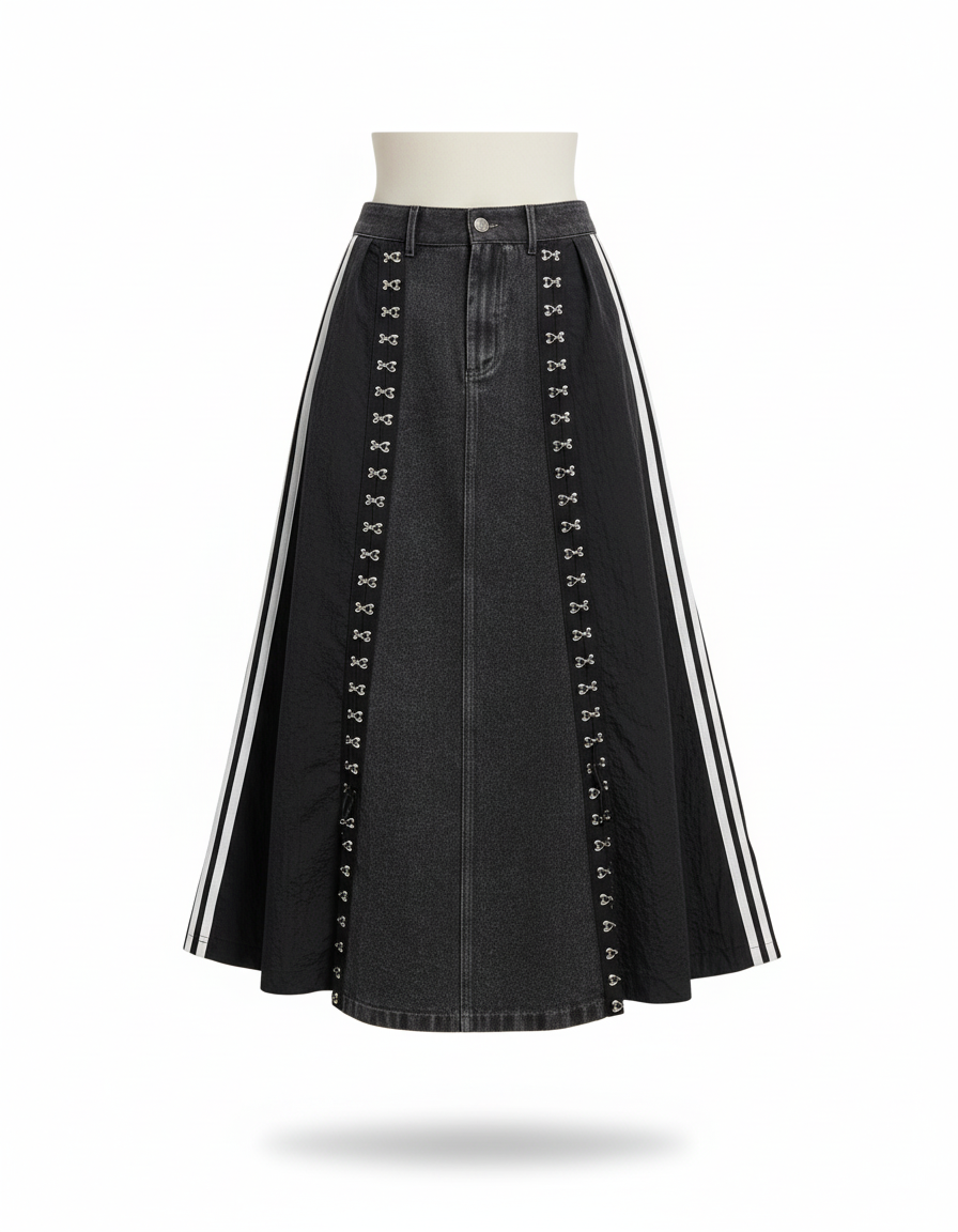 Jupe En Jeans Noir Longue avec Bandes Latérales