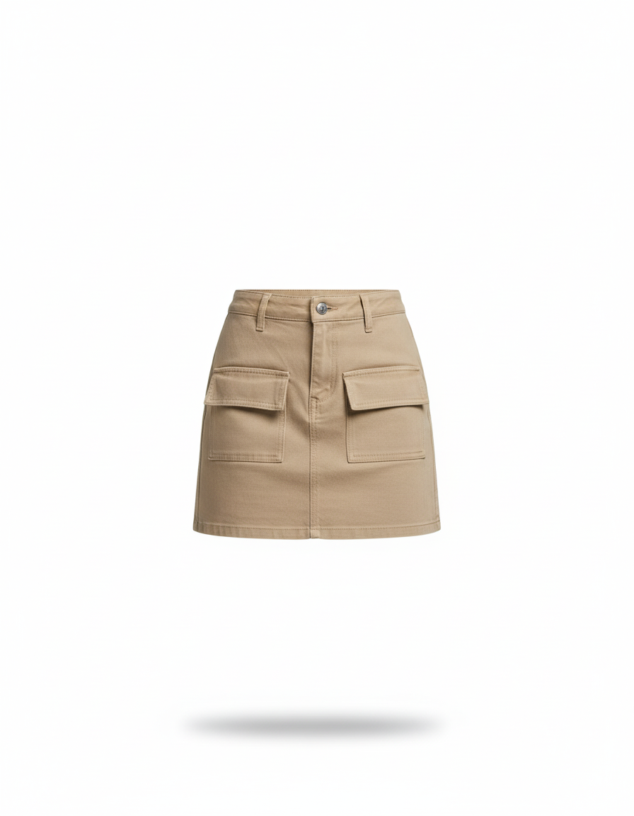 Cette jupe est une jupe courte de couleur beige. Elle présente deux poches cargo à rabat sur le devant.
