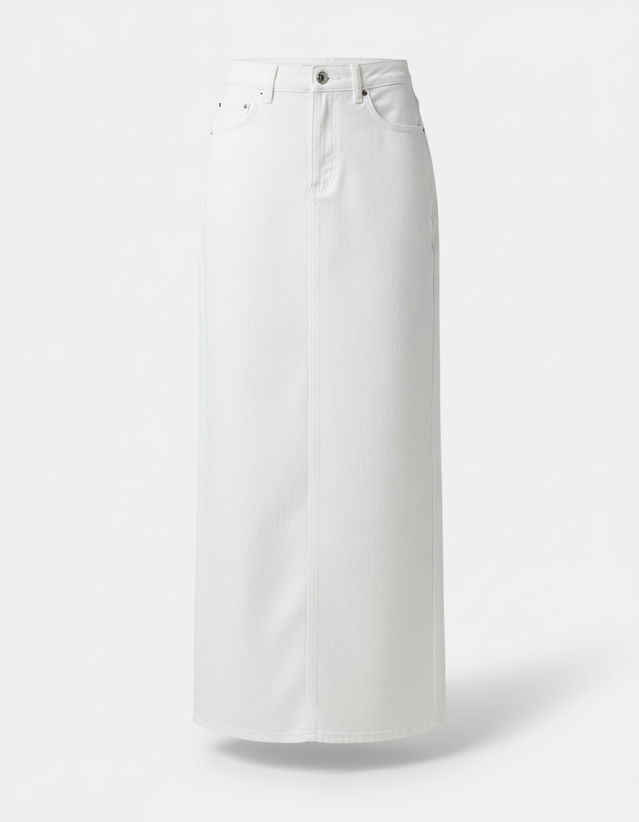 Découvrez notre jupe longue en jean blanc, une pièce essentielle pour un look décontracté et tendance.