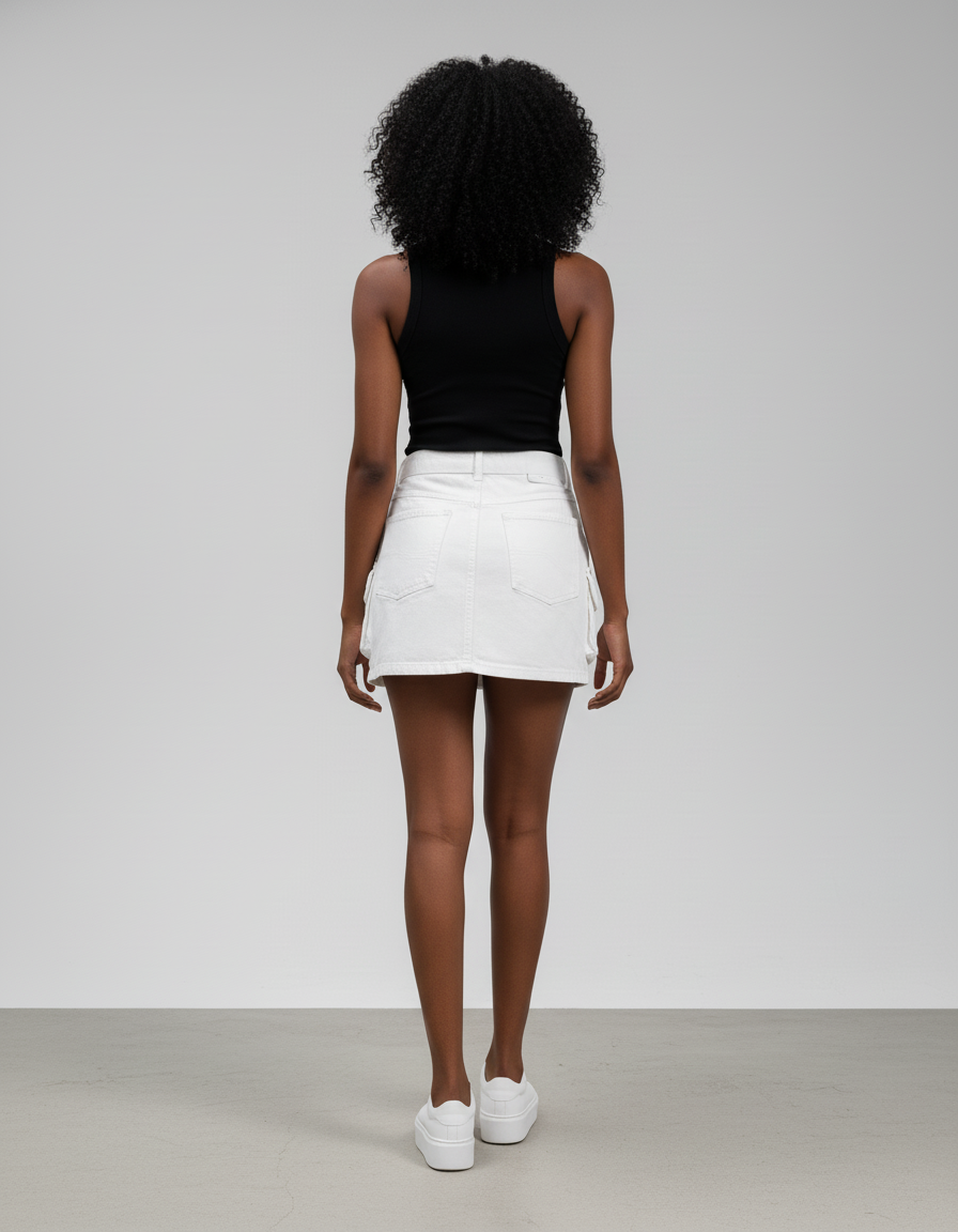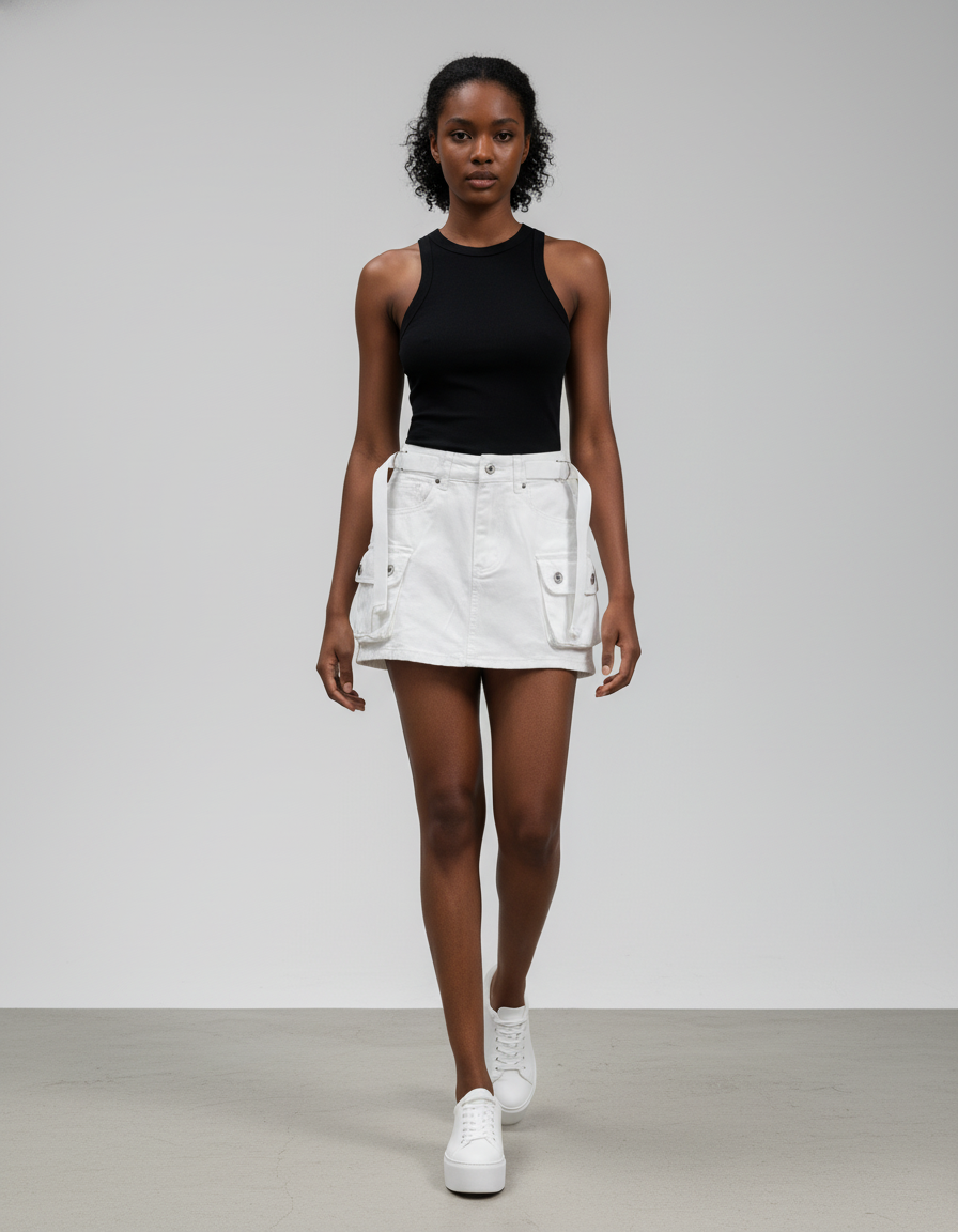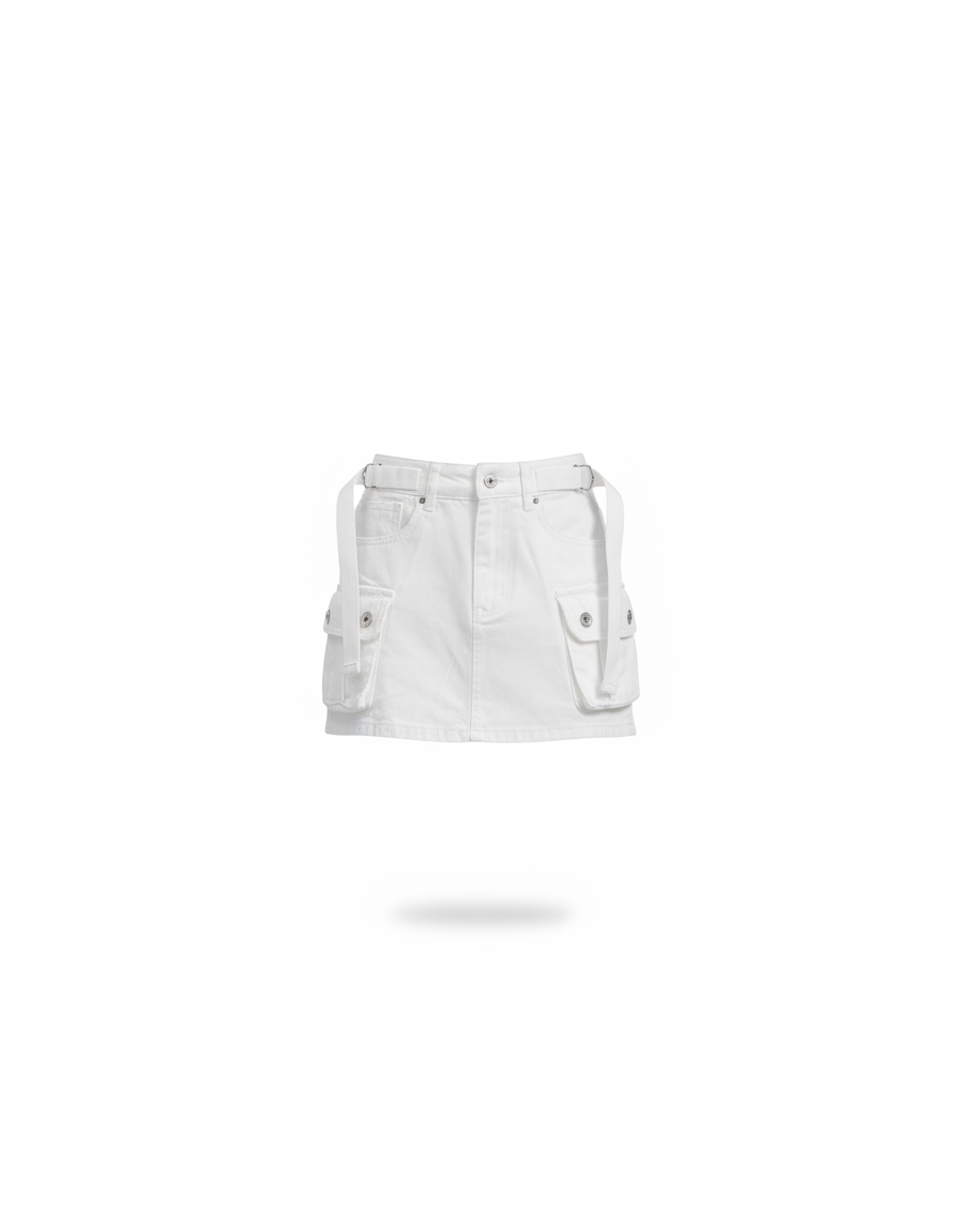 Façonnée dans un denim blanc premium, cette jupe se distingue par ses détails cargo ingénieux : des poches plaquées stratégiquement placées et des sangles ajustables qui ajoutent une dimension texturée unique et un caractère résolument contemporain. Loin des modèles classiques, son design innovant marie l'esthétique utilitaire à une coupe impeccable, garantissant une finition haut de gamme. Chaque élément est pensé pour offrir un confort optimal et une durabilité exceptionnelle, faisant de cette jupe une déclaration de style affirmée et exclusive.