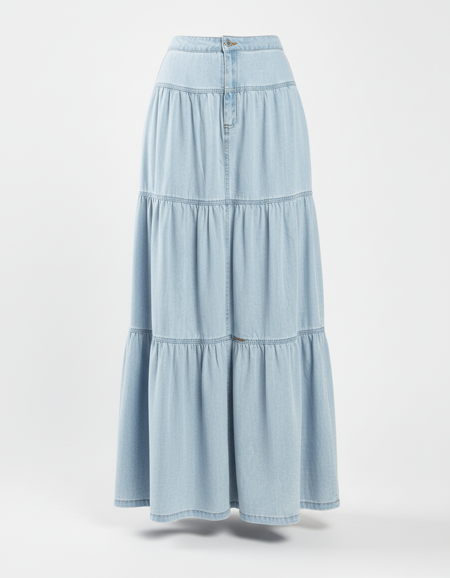 Cette jupe en jean est une pièce longue pour femme, confectionnée en denim bleu clair. Elle présente une coupe évasée avec des volants étagés.