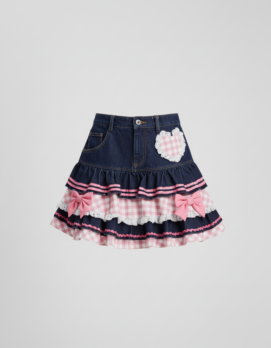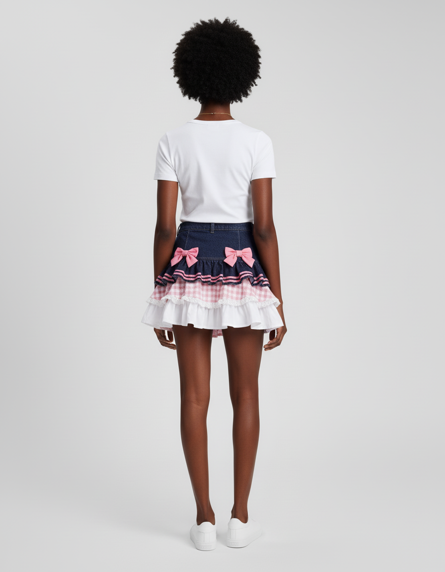 Cette jupe en jean bleu foncé présente une coupe courte avec des volants superposés. Elle est ornée de détails à carreaux roses et blancs.
