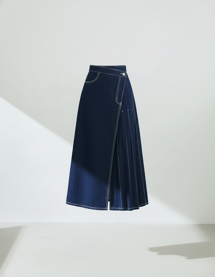 Jupe Jean Bleue Foncée Plissée Irrégulière Décontractée – Modèle Portefeuille Midi