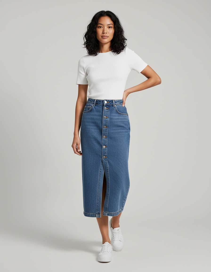 Polyvalente et intemporelle, cette jupe s'adapte à toutes vos envies. Pour un look quotidien chic, associez-la à un t-shirt en maille fine et des baskets blanches épurées, comme la photo le suggère si bien. En soirée, transformez-la avec un chemisier en soie, des talons et quelques bijoux délicats pour une allure sophistiquée. Pour une touche décontractée mais toujours élégante, un pull en cachemire ou une veste en jean assortie complétera parfaitement votre tenue. La Jupe Jean Boutonnée Longue Élégante est une invitation à exprimer votre style, sans compromis.