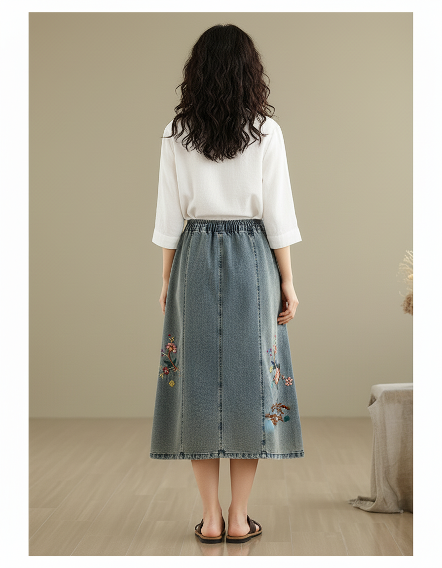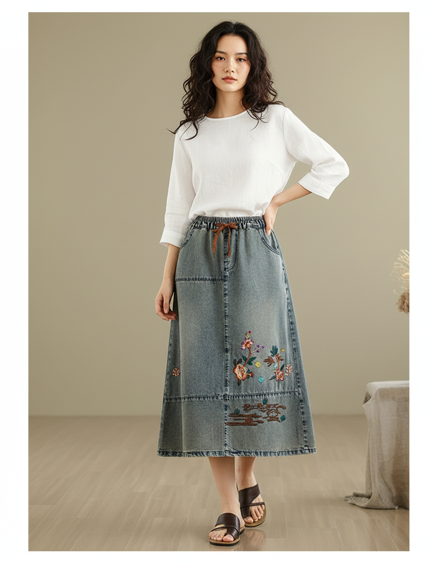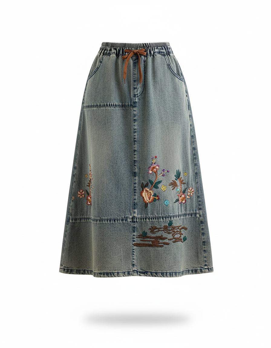 La Jupe Jean Brodée Midi Bohème : L'Art du Mouvement Élégant