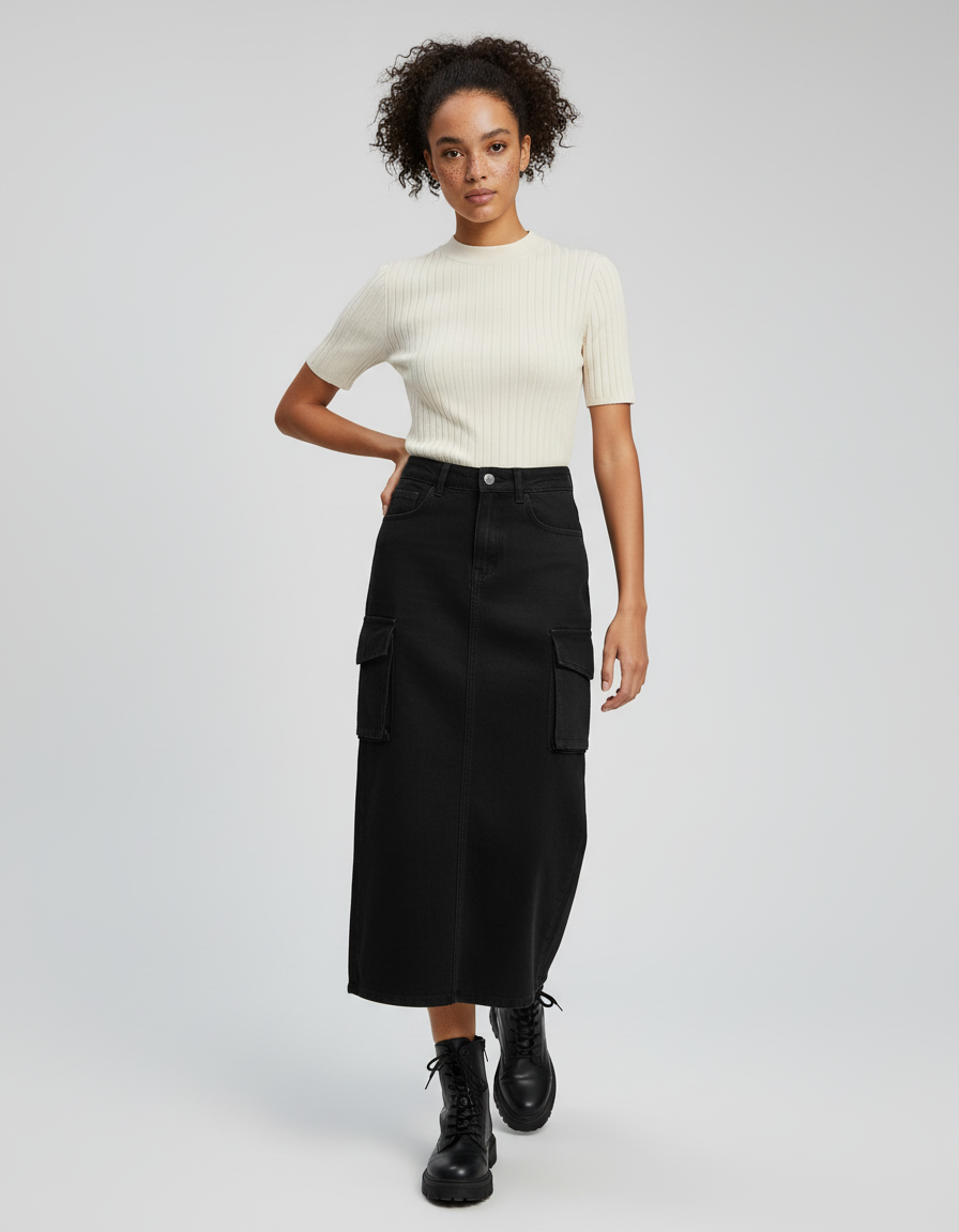 La Jupe Jean Cargo Droite Décontractée en noir est une pièce maîtresse versatile, conçue pour s'adapter à chaque facette de votre vie. Pour une tenue de jour raffinée, associez-la à un top en maille fine et des bottines audacieuses, créant une silhouette moderne et décontractée. En soirée, osez la métamorphose en l'accompagnant d'une blouse vaporeuse et de talons élégants pour une allure sophistiquée et audacieuse. Ses poches cargo discrètes, signature de son style, ajoutent une dimension pratique et tendance.