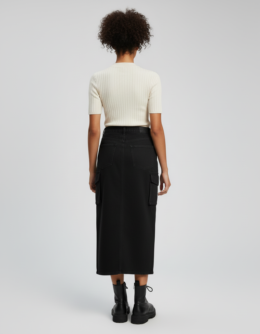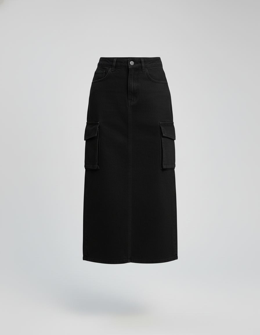 Cette jupe en jean est de couleur noire, avec une coupe droite et des poches cargo latérales. Sa longueur atteint la mi-mollet.