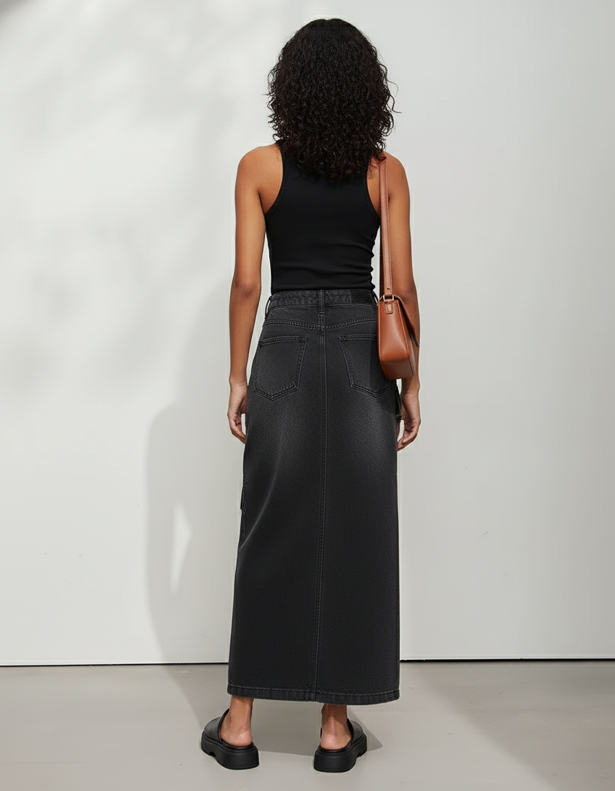 Adoptez un look décontracté et tendance avec notre jupe longue en jean coupe droite, parfaite pour toutes les occasions.