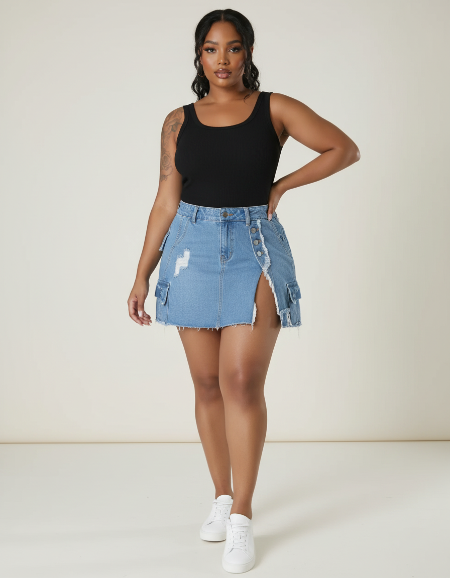 Découvrez notre Jupe Jean Délavée Déchirée, une pièce maîtresse conçue pour celles qui ne transigent ni sur le style, ni sur l'attitude. Avec son denim bleu authentique et ses détails subtilement déchirés, elle insuffle une touche rebelle-chic à toutes vos tenues. Sa coupe fendue audacieuse et ses poches cargo confèrent une modernité assumée. Idéale pour une sortie décontractée avec un crop top et des baskets, elle se transforme aisément pour un look plus sophistiqué : associez-la à une blouse fluide et des talons pour un dîner inattendu.