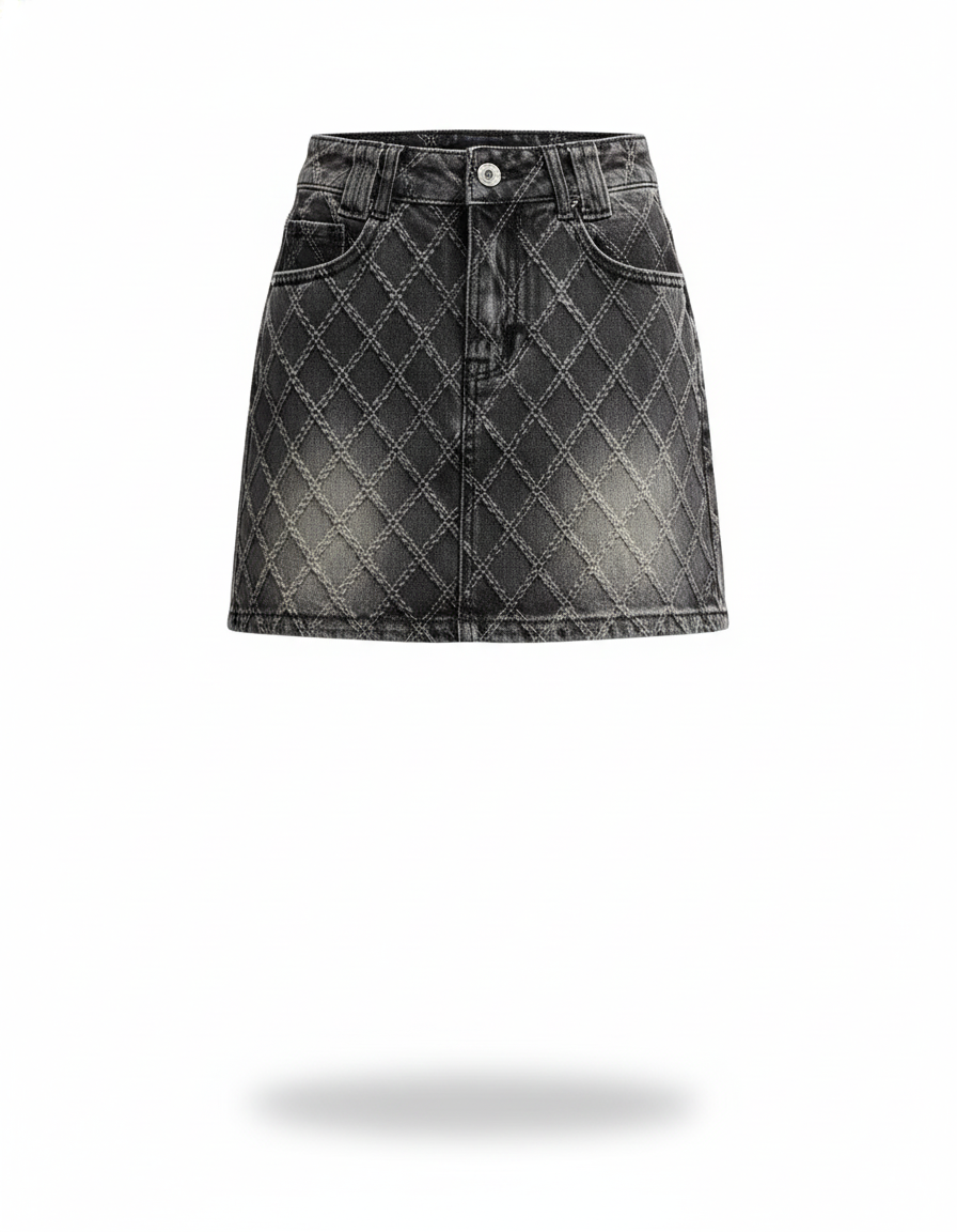 Cette jupe en jean courte est de couleur gris délavé avec un motif en losanges sur toute la surface. Elle est dotée d'une fermeture à bouton et à glissière sur le devant.