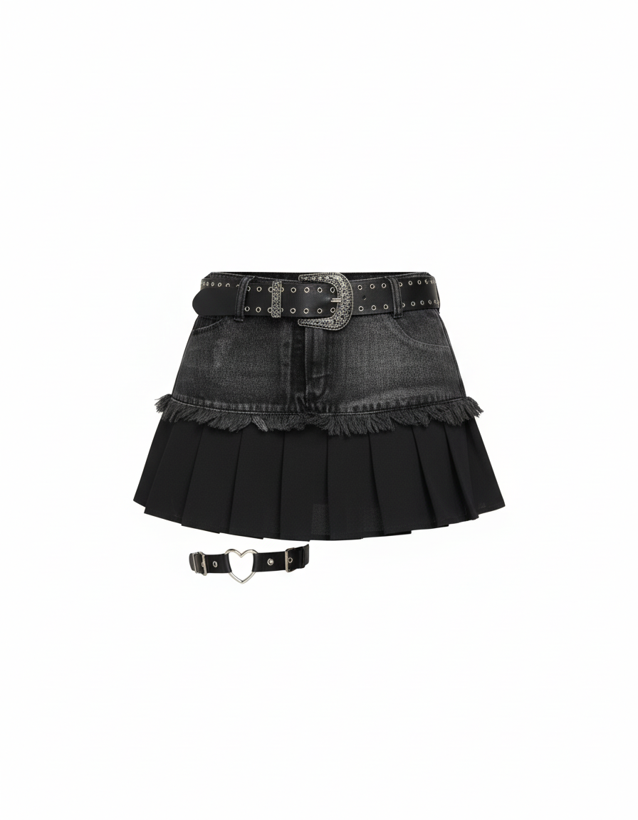 Cette jupe combine une partie en **jean délavé** avec un ourlet effiloché et une section plissée noire. Elle présente une coupe mini.