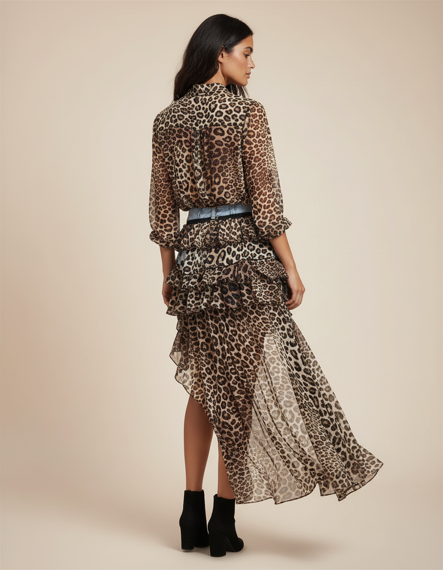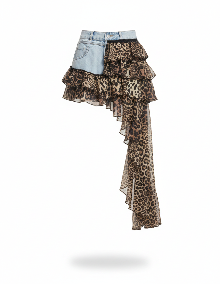 Conçue pour la femme moderne, cette jupe garantit un confort absolu sans jamais compromettre le style. Le denim, sélectionné pour sa douceur et sa souplesse, épouse la silhouette tandis que les volants en imprimé léopard, légers et aériens, offrent une liberté de mouvement inégalée. Son tombé impeccable met en valeur vos jambes, et la fluidité de sa traîne asymétrique crée une silhouette dynamique et résolument contemporaine. Une pièce qui allie l'audace du design à la promesse d'un bien-être durable.