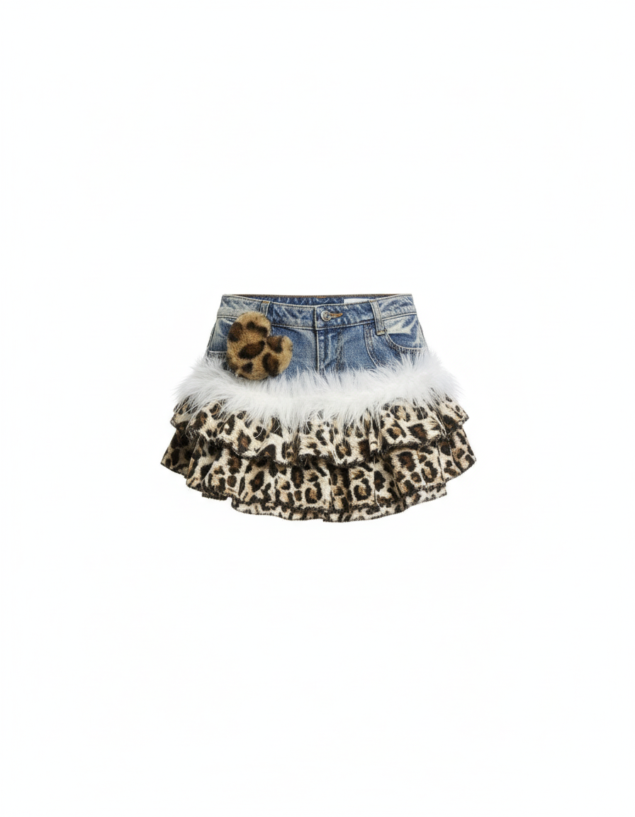 Cette jupe combine une base en denim avec une bordure en fausse fourrure blanche et un volant à imprimé léopard. Elle présente une coupe courte et un détail en forme de patte sur le devant.
