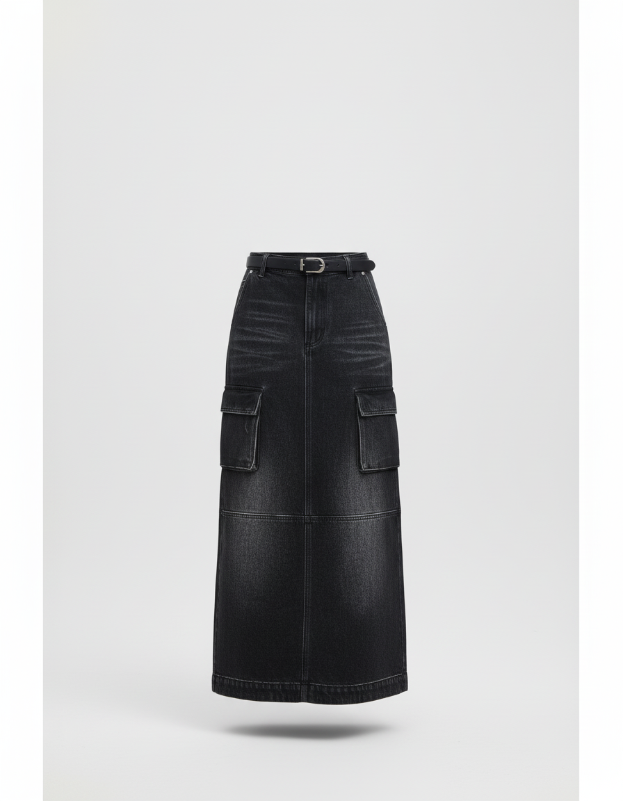 Optez pour un style moderne et décontracté avec notre jupe longue en jean cargo gris délavé, une pièce maîtresse pour votre garde-robe urbaine.