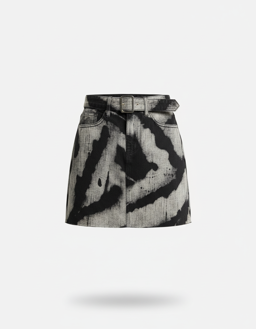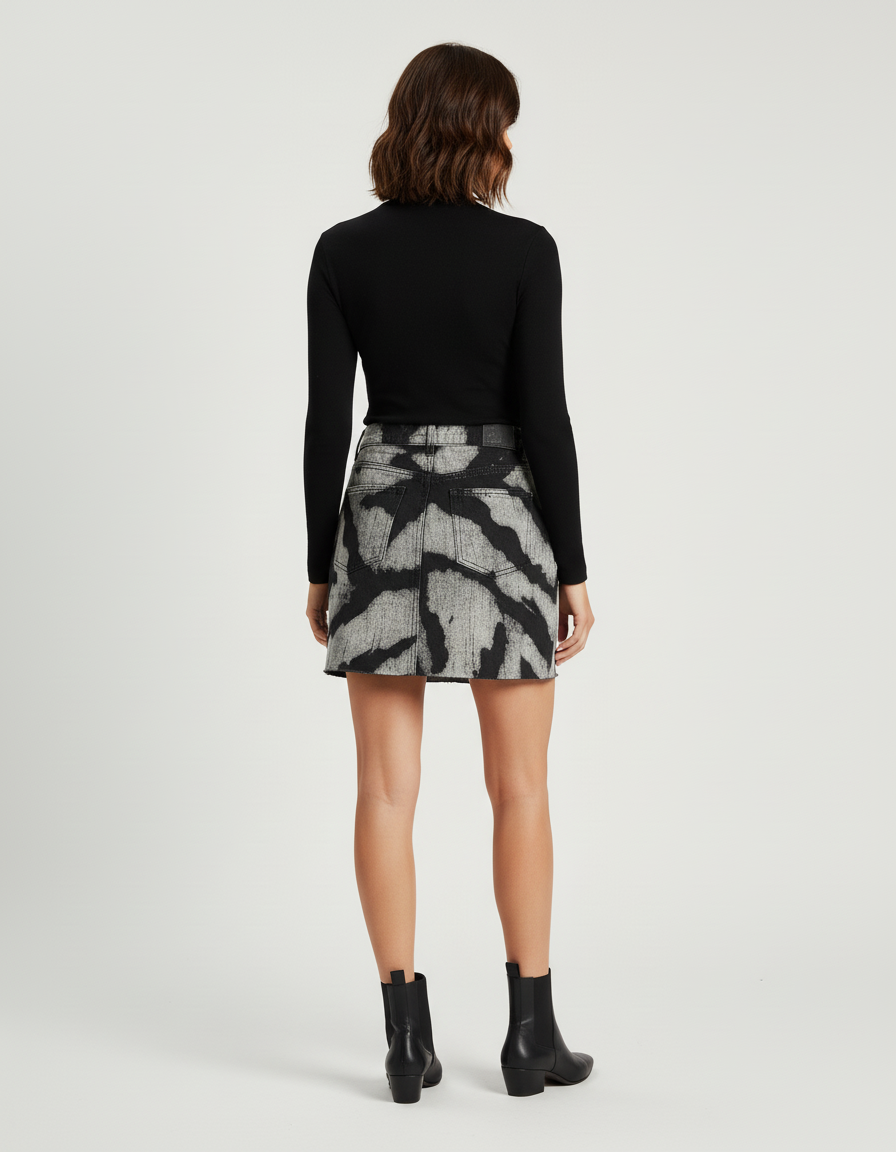 Cette jupe en jean est de coupe mini et présente un motif délavé gris et noir.
