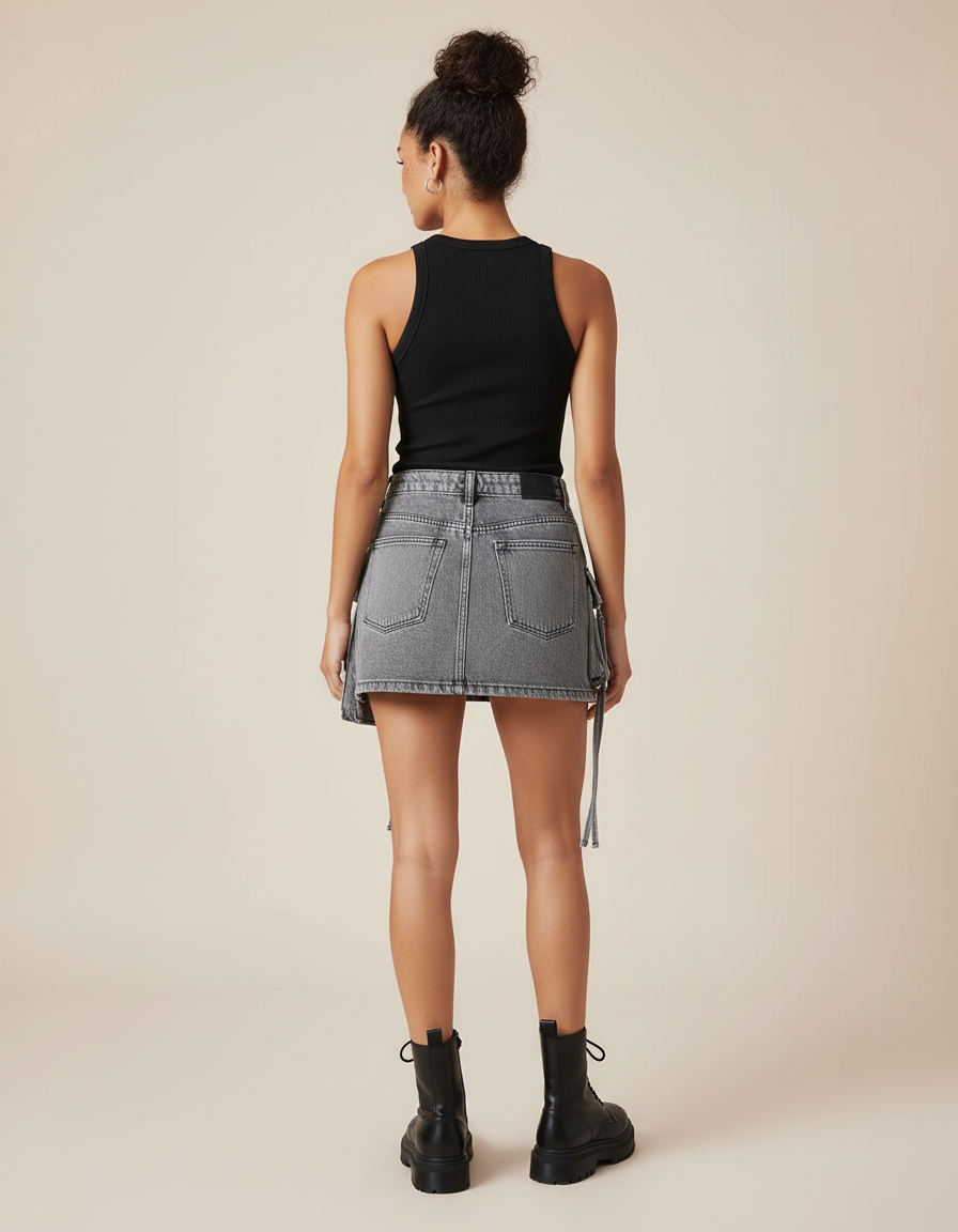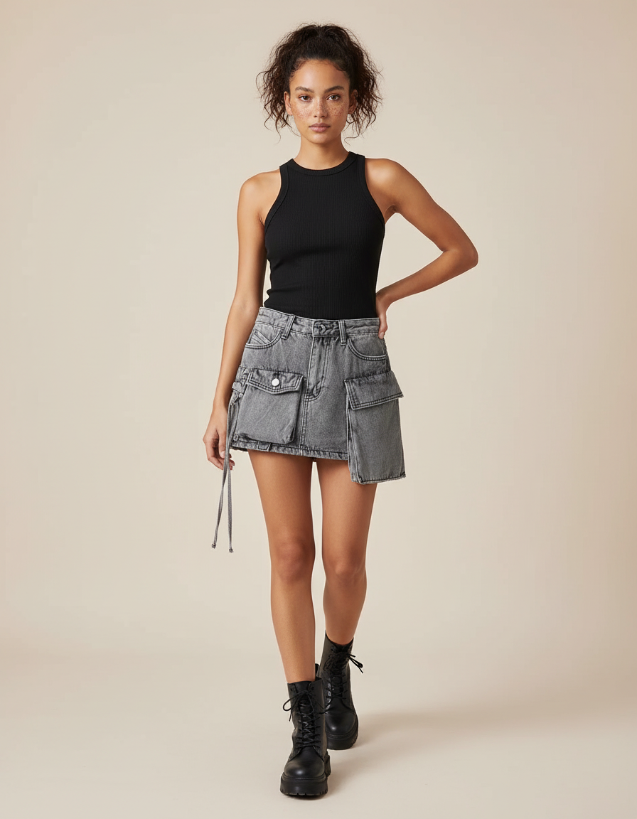 Adoptez la 'Jupe Jean Gris Délavé Poches Cargo Décontractée' pour une allure résolument moderne et audacieuse. Son design asymétrique et ses poches cargo fonctionnelles confèrent une touche utilitaire chic, parfaite pour toutes vos sorties. Mariez-la à un débardeur côtelé noir et des bottines chunky pour un look urbain affirmé, comme sur l'image. Pour une approche plus sophistiquée, associez-la à un chemisier en soie fluide et des talons pour un dîner, ou à un blouson en cuir pour une soirée entre amis. Elle s'adapte à chaque envie, transformant le quotidien en une opportunité d'expression unique.